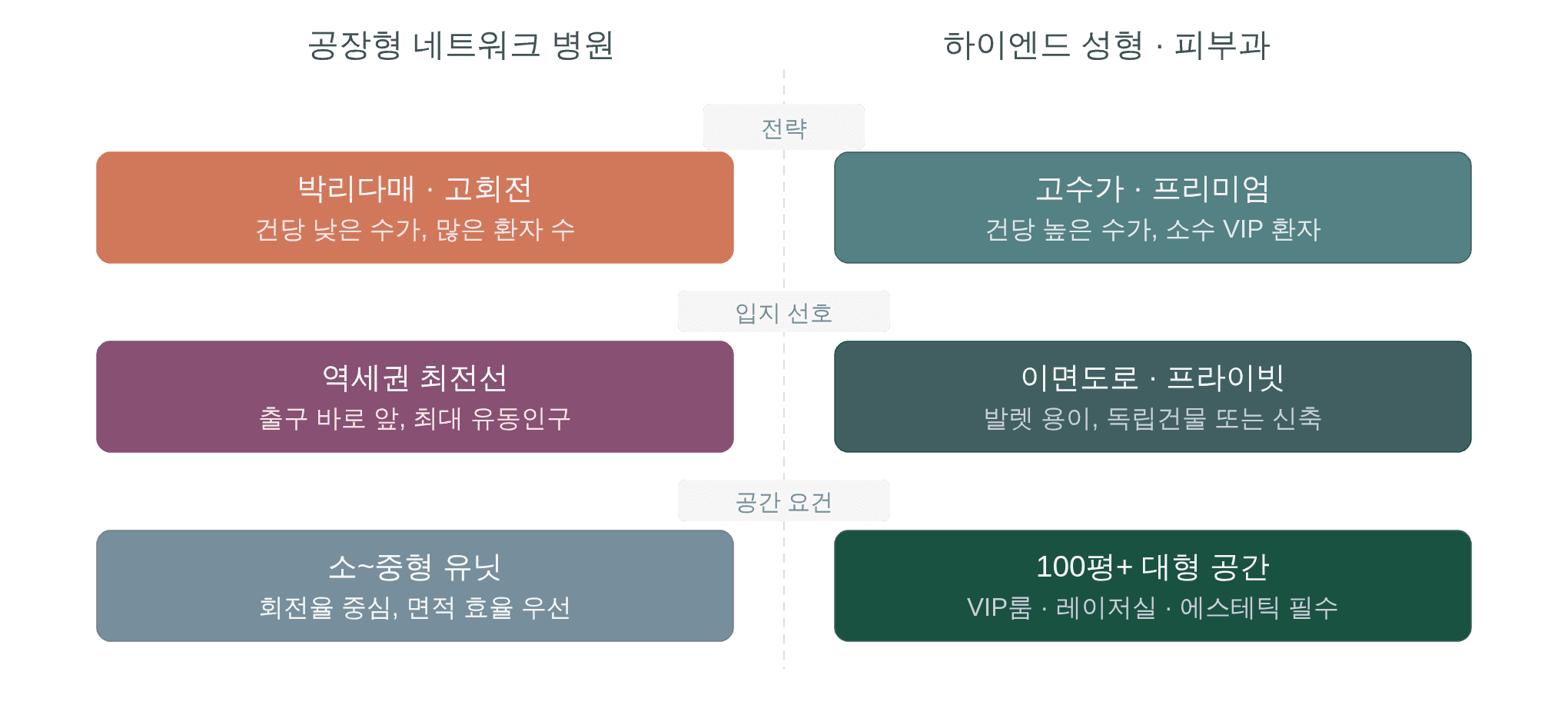 확실히 구분됩니다. 박리다매 전략을 취하는 소위 '공장형' 네트워크 병원들은 접근성이 최우선입니다. 지하철역 출구 바로 앞, 유동인구가 가장 많은 곳을 선호하며 임대료가 다소 비싸더라도 회전율로 이를 상쇄합니다.