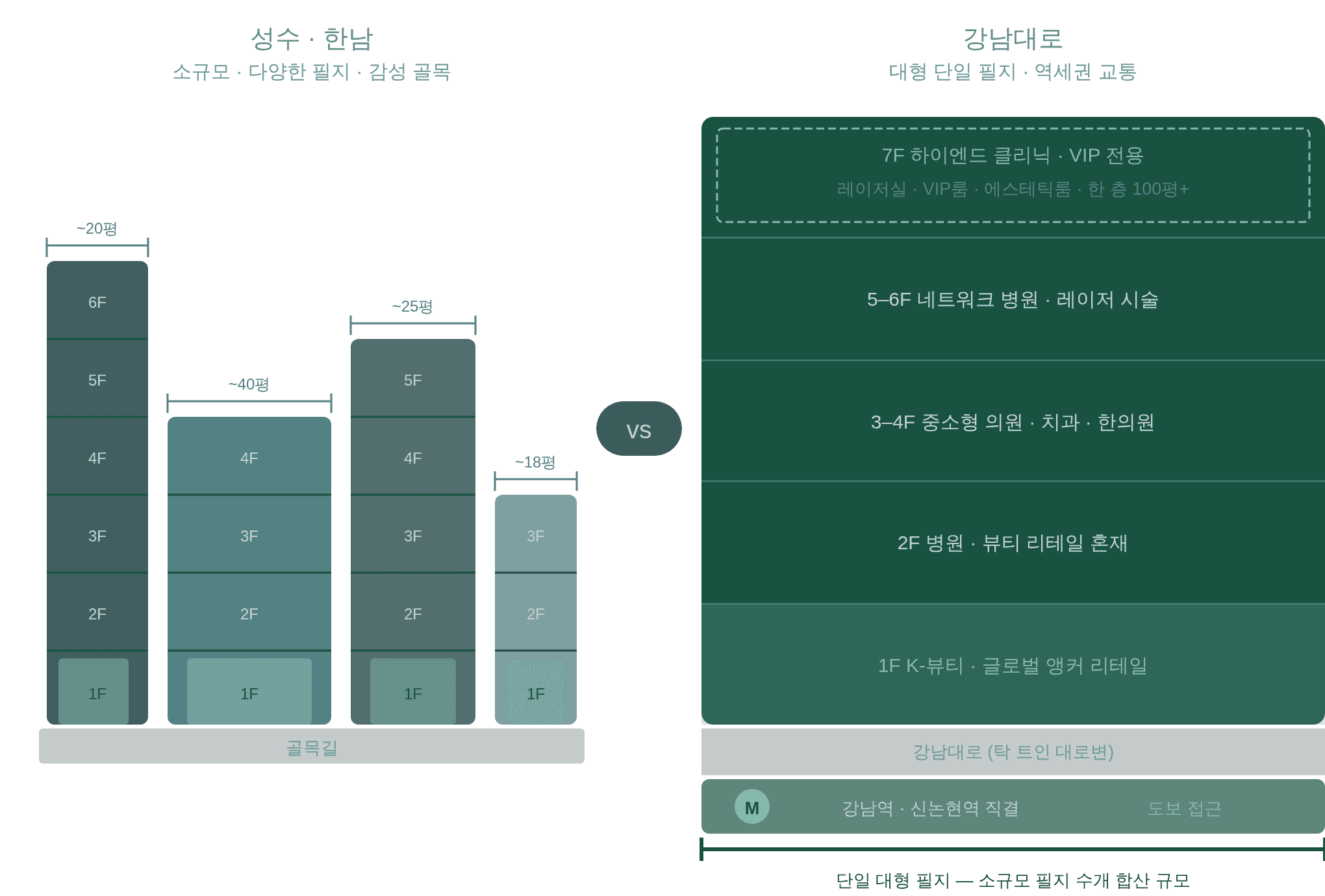 성수나 한남동이 좁은 골목길과 아기자기한 소규모 필지를 중심으로 '감성'을 판다면, 강남대로는 탁 트인 대로변과 넓은 바닥 면적으로 메디컬에 그야말로 최적화 되어있습니다.