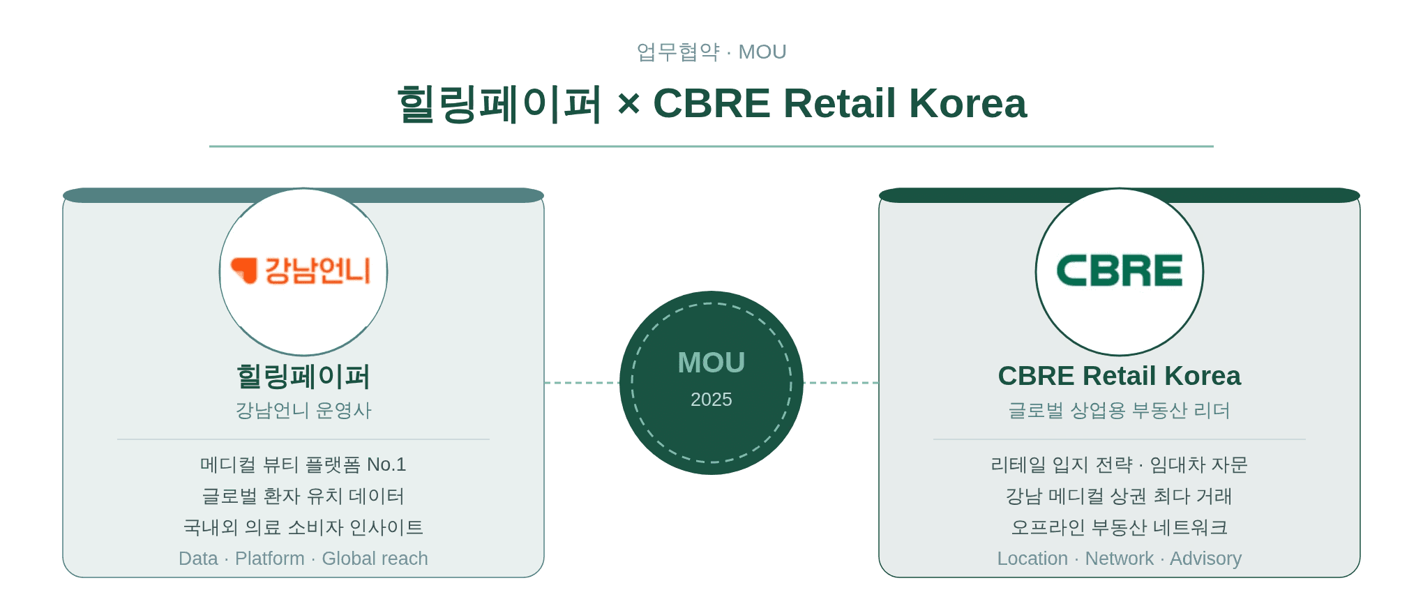 CBRE 코리아와 힐링페이퍼(강남언니 운영사)의 MOU는 단순히 두 회사가 손을 잡았다는 의미를 넘어, 국내 1위 상업용 부동산 솔루션과 1위 메디컬 뷰티 플랫폼이 결합했다는 데 큰 의의가 있습니다.