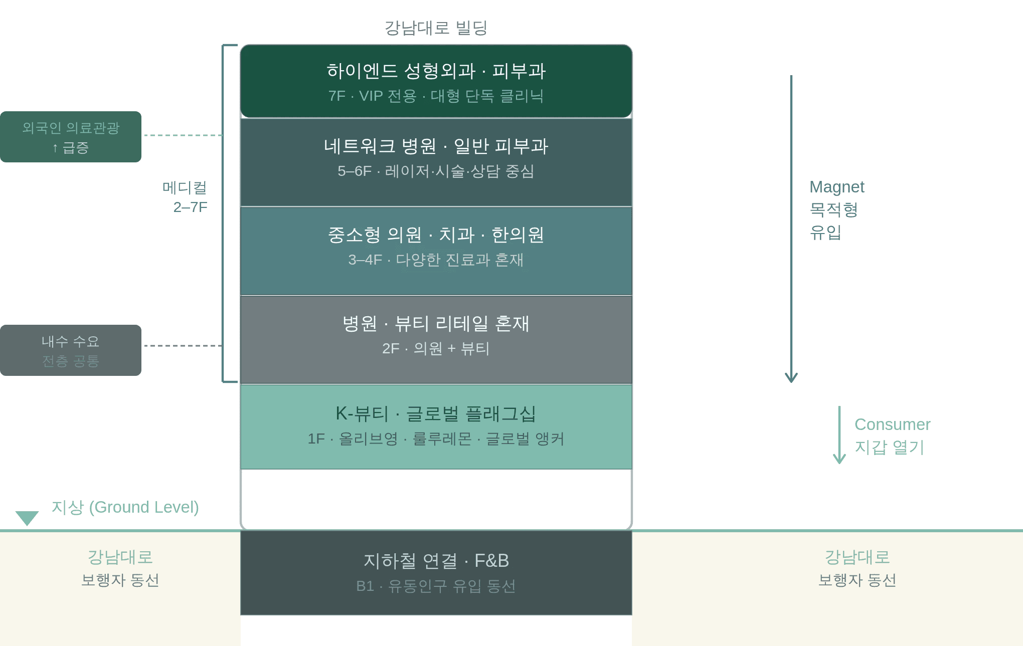 강남구의 연간 의료관광 소비액이 1,200억 원을 넘어서고, 서울시 전체 의료 소비의 절반 가까이가 강남에서 발생합니다(서울시 의료관광 통계, 2024 기준). 메디컬이 상층부에서 확실한 목적형 고객을 끌어모으고(Magnet), 리테일이 저층부에서 이들의 지갑을 여는(Consumer) 완벽한 상호 보완 구조가 완성된 것입니다.