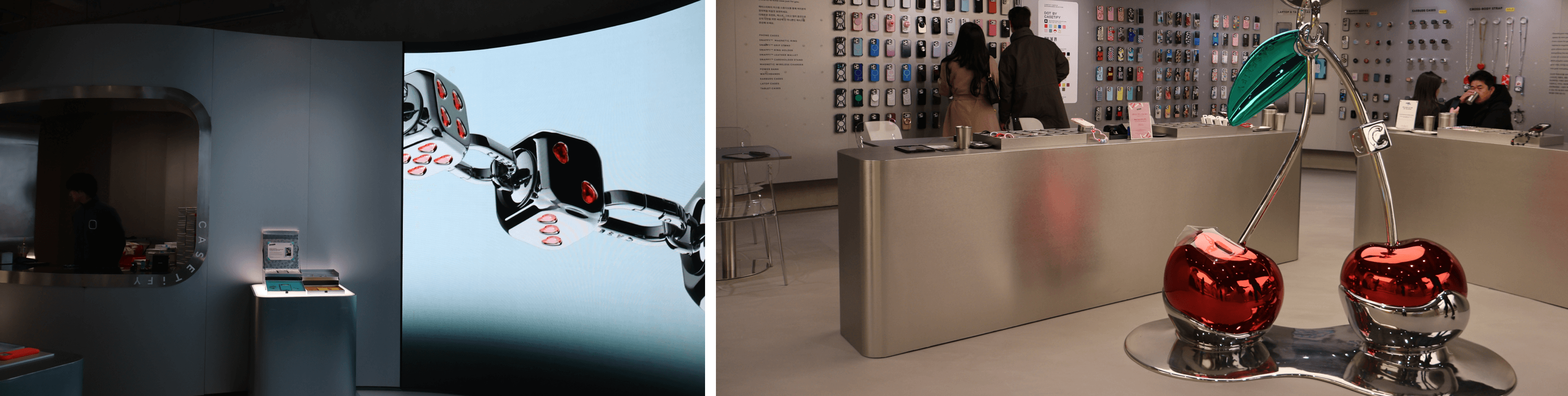 케이스티파이 도산은 브랜드의 기술적 정체성과 예술적 유희가 결합된 피지털(Phygital) 공간의 정수를 보여줍니다. 이 공간은 대담하고 유쾌한 미래지향적 분위기를 풍깁니다. 금속 소재와 대비되는 화려하고 강렬한 컬러의 활용은 "누구나 자신만의 색을 드러낼 수 있다"는 브랜드의 슬로건을 시각적으로 강렬하게 전달합니다.