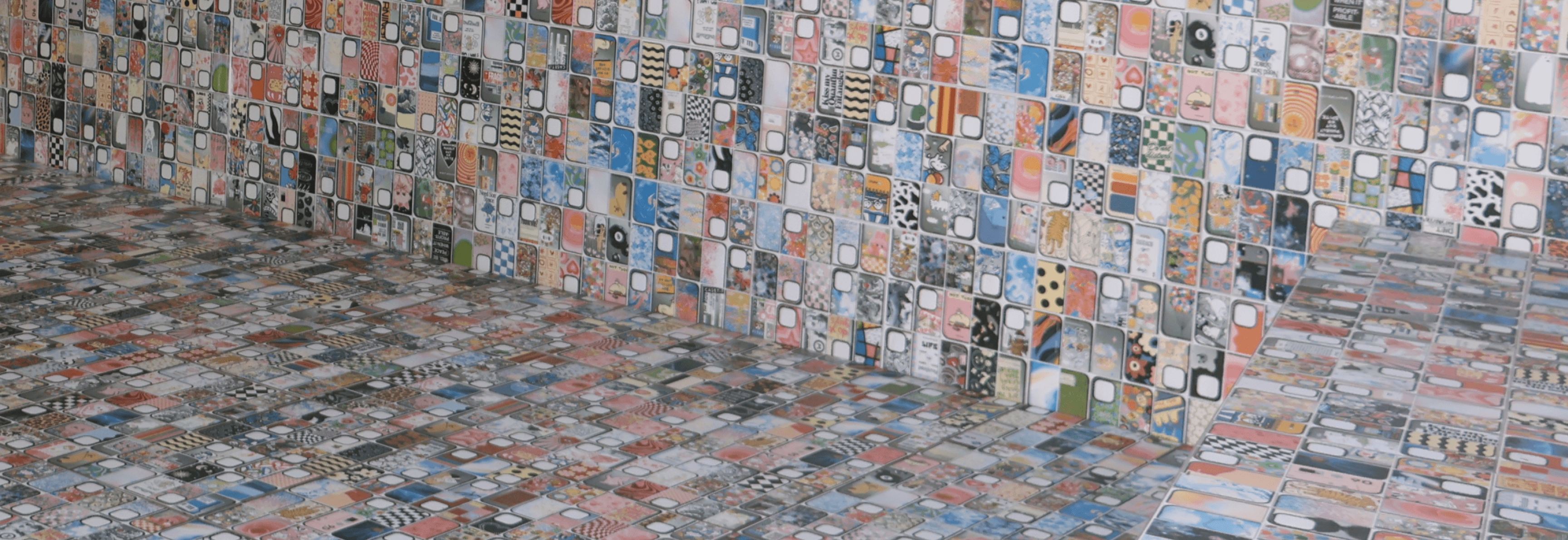 수천 개의 케이스를 벽면 그리드 위에 정렬하여 무형의 디지털 데이터를 눈으로 만질 수 있는 픽셀 아트로 변환한다.