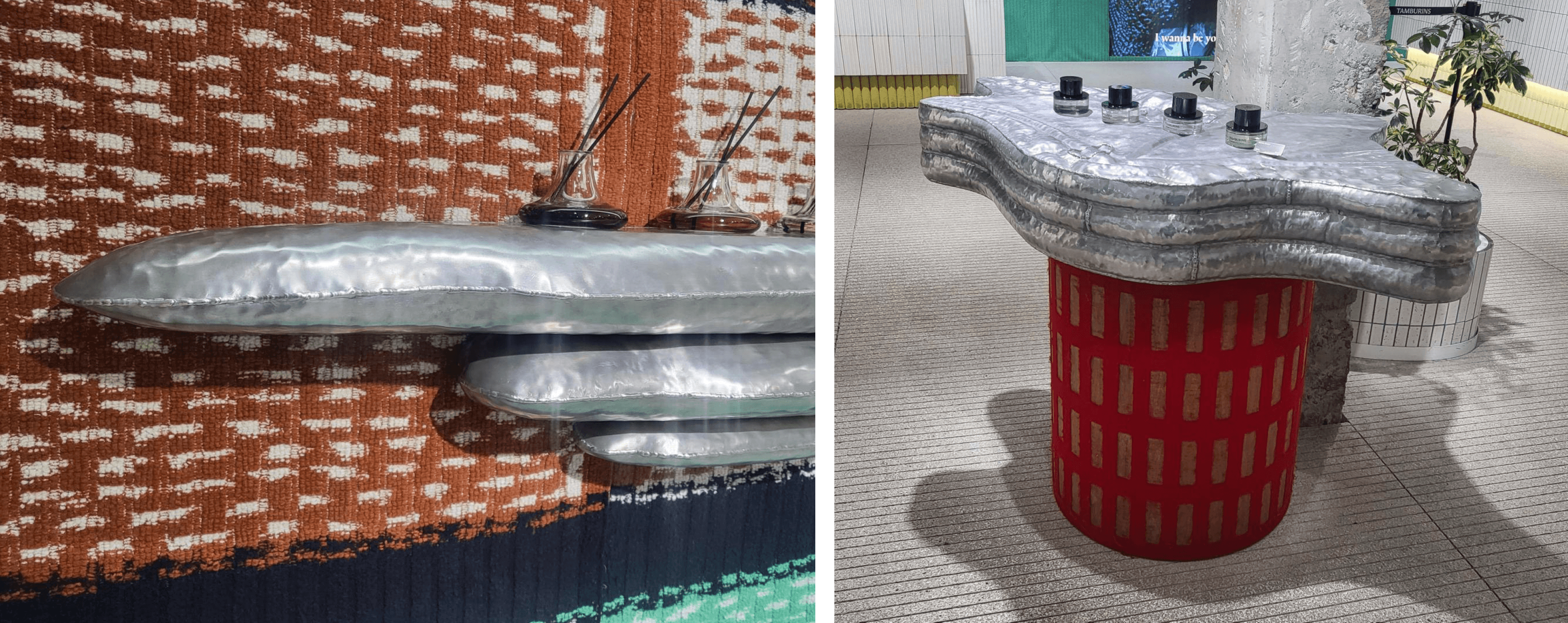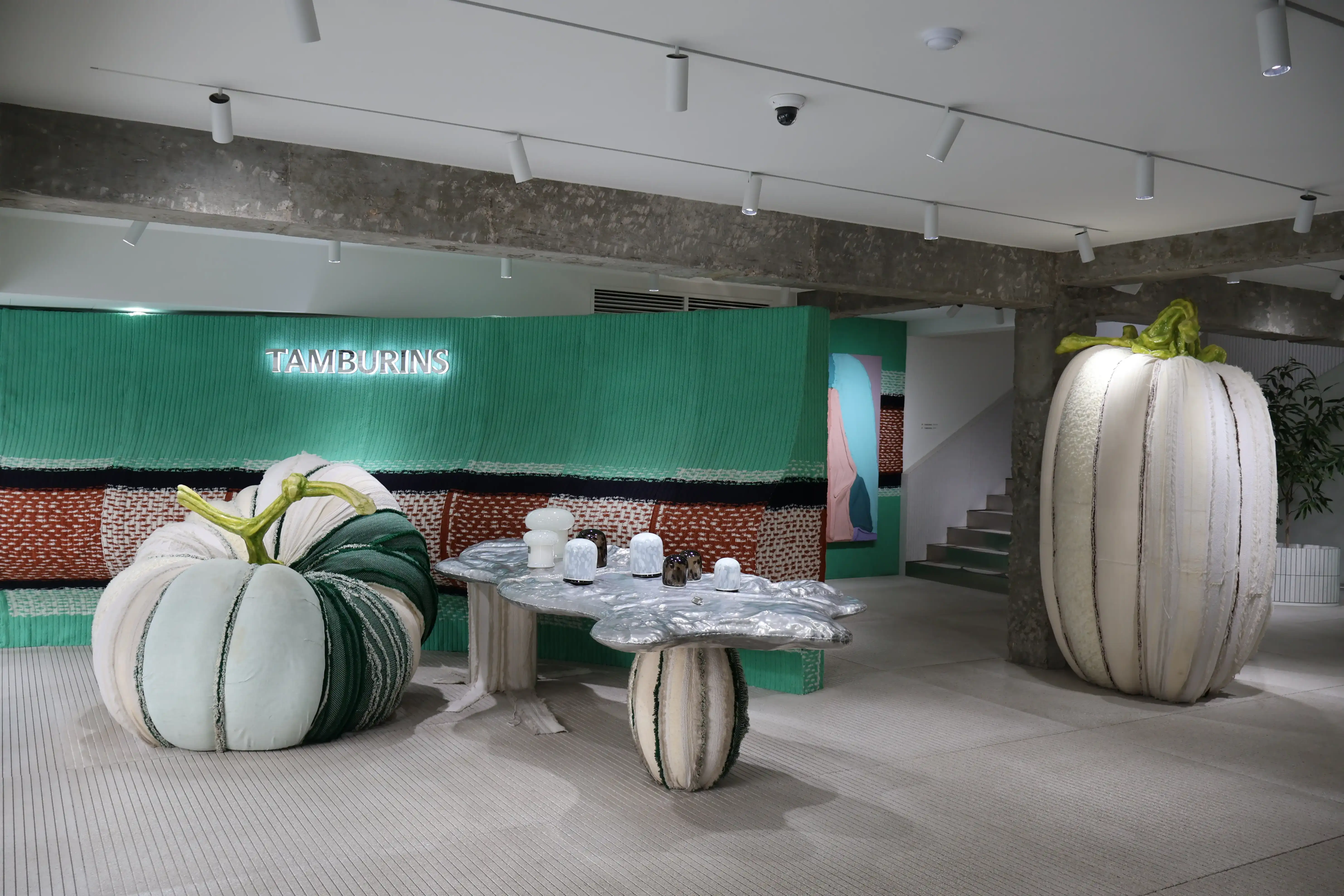 정형화된 그리드나 텍스쳐를 깨고 곡선형 테이블, 패브릭과 원뿔형 오브제를 자유롭게 배치하여 방문객이 조형물 사이를 유영하는 리듬감을 느끼게 한다.
