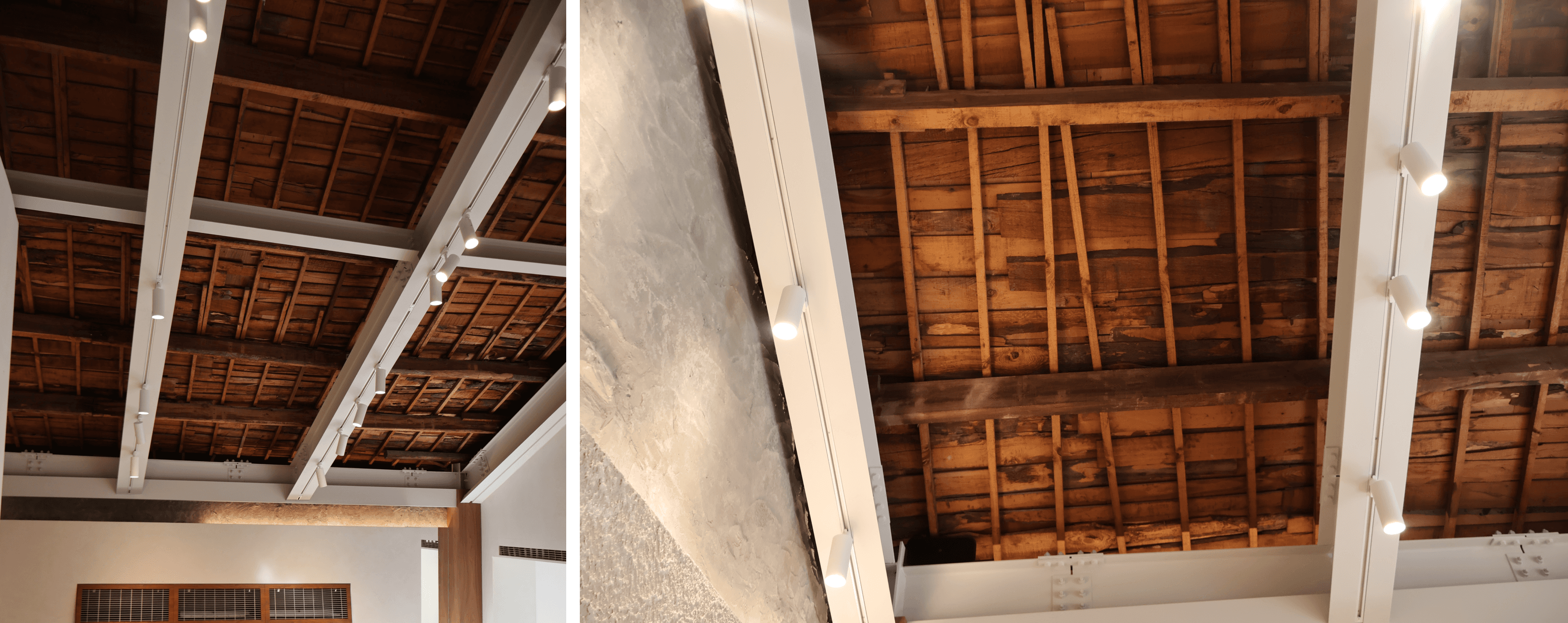 한국 전통 서까래와 현대적 화이트 H-빔, 트랙 조명을 교차시켜 전통과 현대의 만남을 시각화한다.