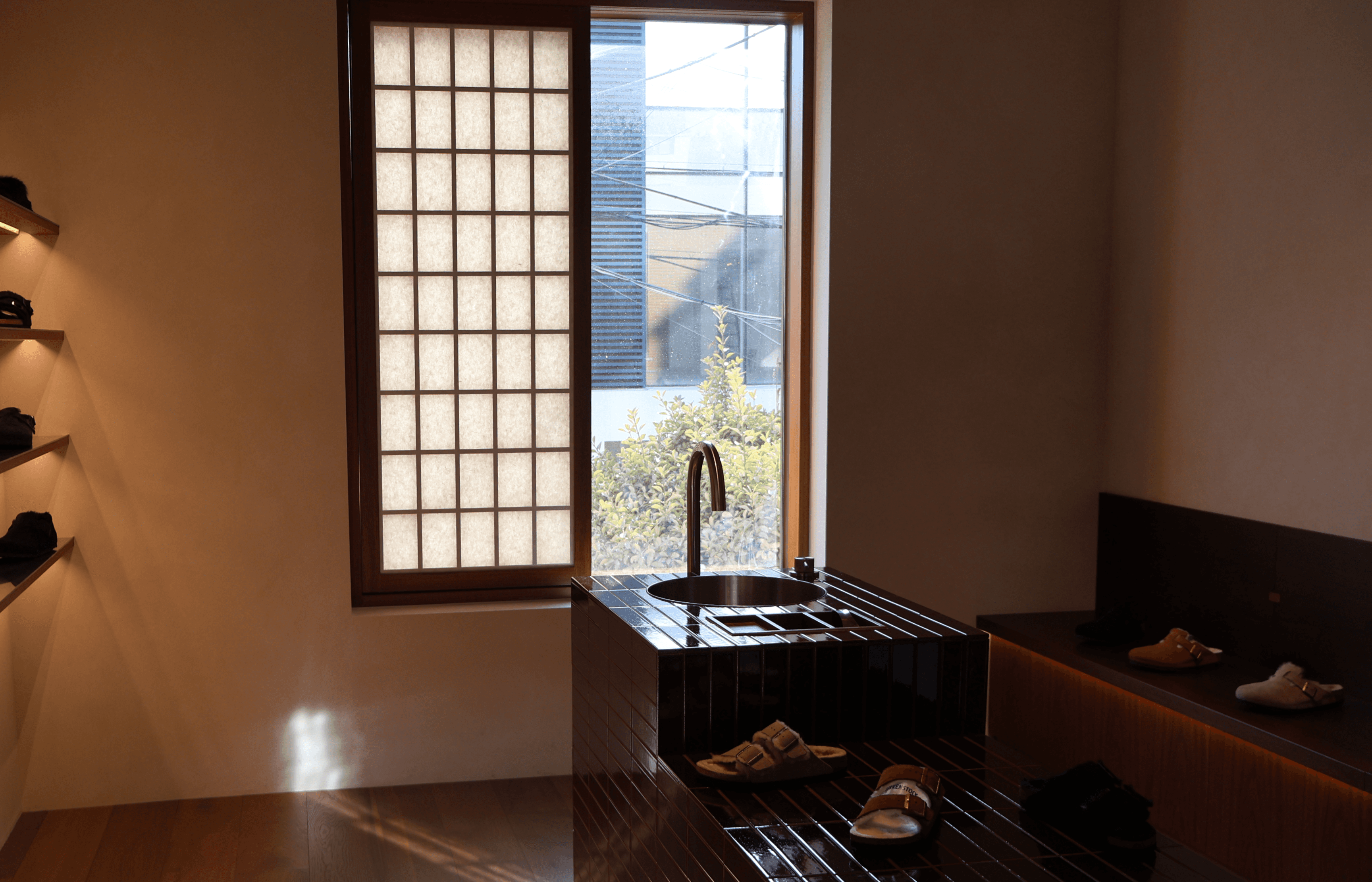 버켄스탁 도산(Birkenstock Dosan)은 단독 주택 형태의 건물과 낮은 돌담, 계단으로 이어지는 입구는 방문객에게 상업적 압박감 대신 환대의 경험을 제공합니다. 매장에 들어서서 가장 눈에 띄는 것은 한국 전통 가옥의 상징인 서까래(Seokkarae)인데 이를 그대로 노출하면서 자연스러움을 살렸습니다. 창을 처리하는 방식에서도 한국적인 미학이 돋보입니다. 격자무늬의 창호(Changho) 느낌을 준 스크린은 외부의 강한 빛을 은은하게 필터링하여 내부 공간에 깊이감을 더합니다. 그래픽 디자인에서 불투명도(Opacity)를 조절해 레이어 사이의 깊이감을 만드는 것처럼, 이 창호 스크린은 리테일 매장을 차가운 상업 공간이 아닌 아늑한 '아틀리에'처럼 느껴지게 하는 결정적인 장치입니다.