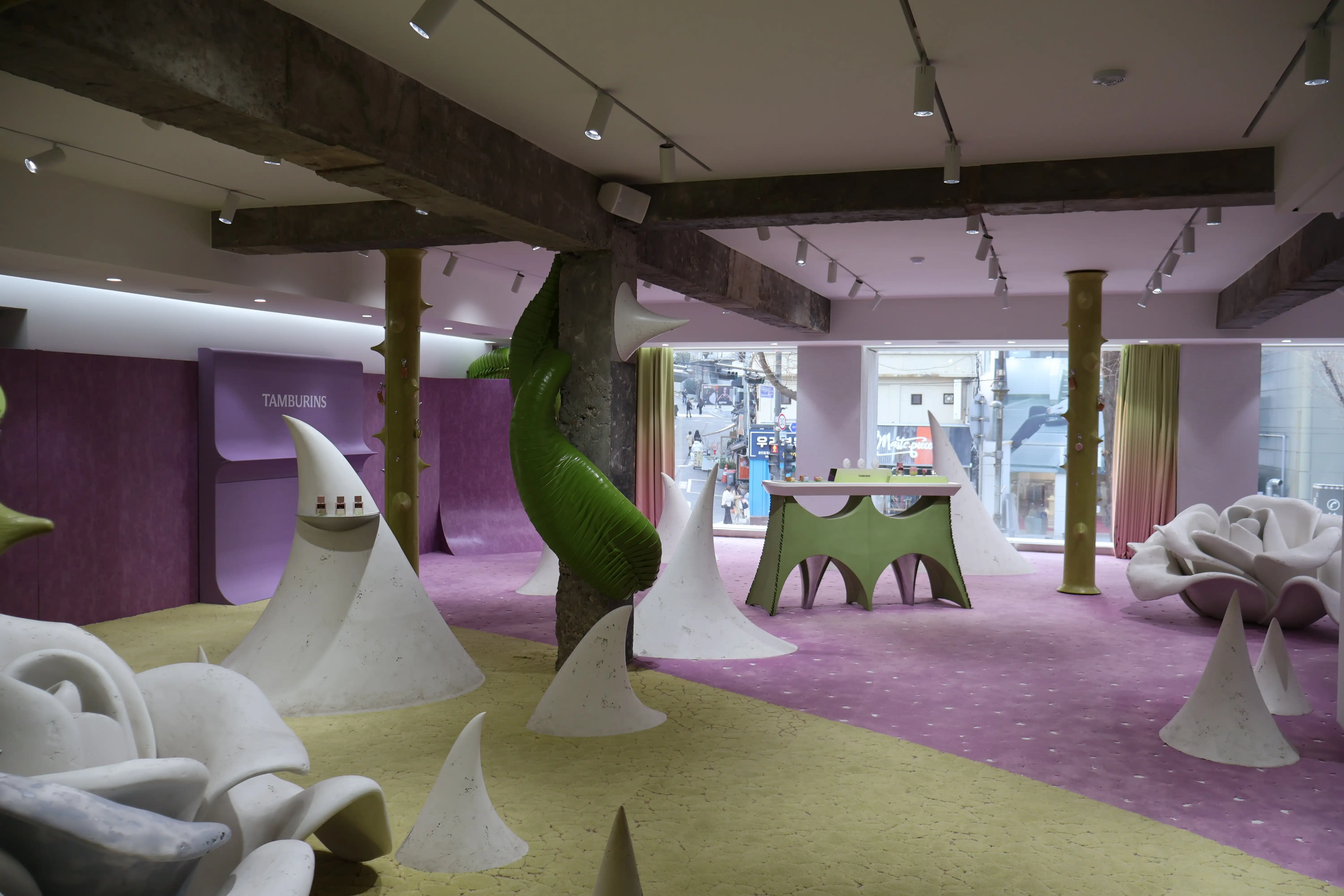 탬버린즈는 거대한 캔버스나 설치 미술품 같은 오브제를 중앙에 배치하여 고객이 매장에 들어서는 순간 "쇼핑"이 아닌 "관람"을 시작한다는 느낌을 받게 합니다. 그래픽 디자인에서 여백이 정보를 돋보이게 하듯, 이 빈 공간은 방문객이 오브제 하나하나에 집중하고 브랜드의 서사 속으로 깊이 몰입하게 만듭니다. 이를 통해서 고객은 이곳에서 제품을 '사는' 행위보다 브랜드의 '취향'을 향유하는 경험을 먼저 하게 됩니다. 또한 탬버린즈는 과감한 컬러 매치를 통해 단순한 매장을 넘어 하나의 그래픽 포스터 속에 들어온 듯한 착시를 선사하면서 공간에 생동감을 부여합니다. 정형화된 진열대 대신 다양한 리듬감을 가진 레이아웃은 고객들로 하여금 일종의 리듬감을 느낄 수 있도록 하면서 조형물 사이를 유영하며 브랜드를 발견하는 재미를 느낍니다.