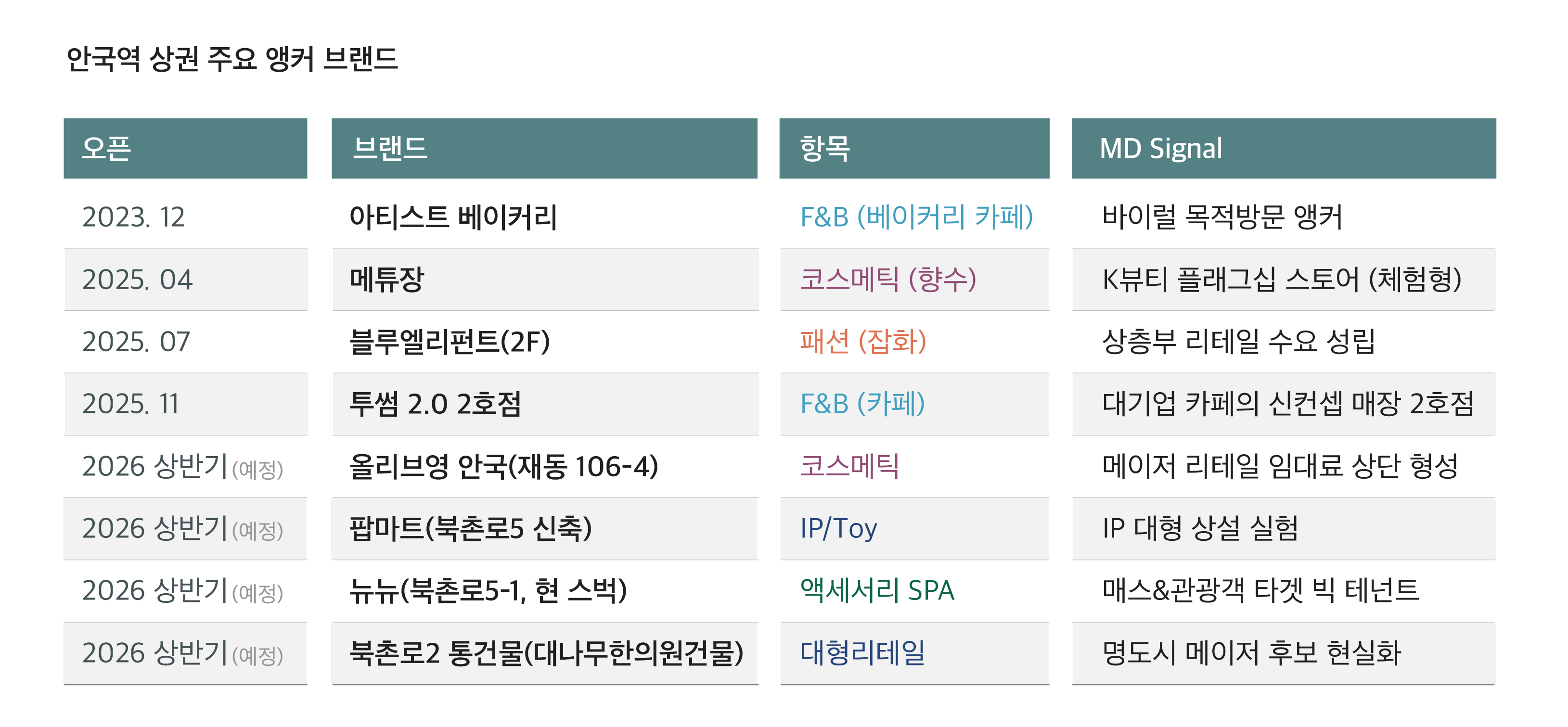 안국역 구간은 북촌 상권의 진입로이자 통건물 플래그십이 집결하는 프라임 상권이다. 외국인 관광객의 필수 목적지로 부상하며 메이저 리테일러의 출점 0순위지가 되었다. 임대료 시세보다 빠른 의사결정 속도가 중요하며, 올리브영과 뉴뉴 같은 대형 브랜드들이 합류하며 상권의 스케일과 마케팅 파워가 더욱 강력해지는 국면이다.