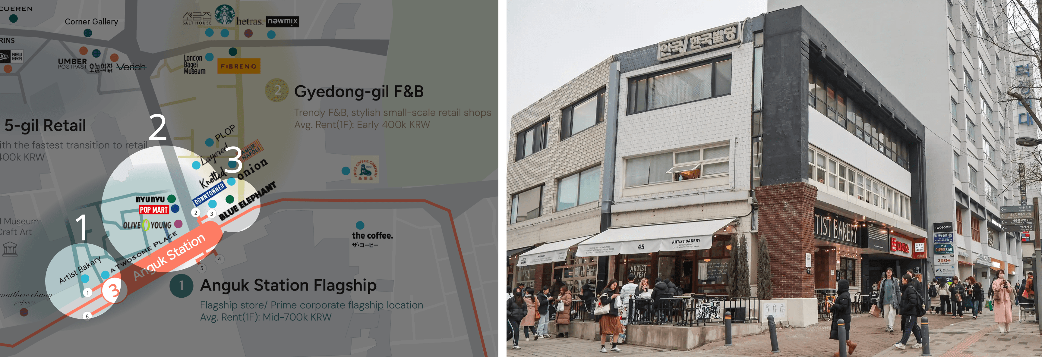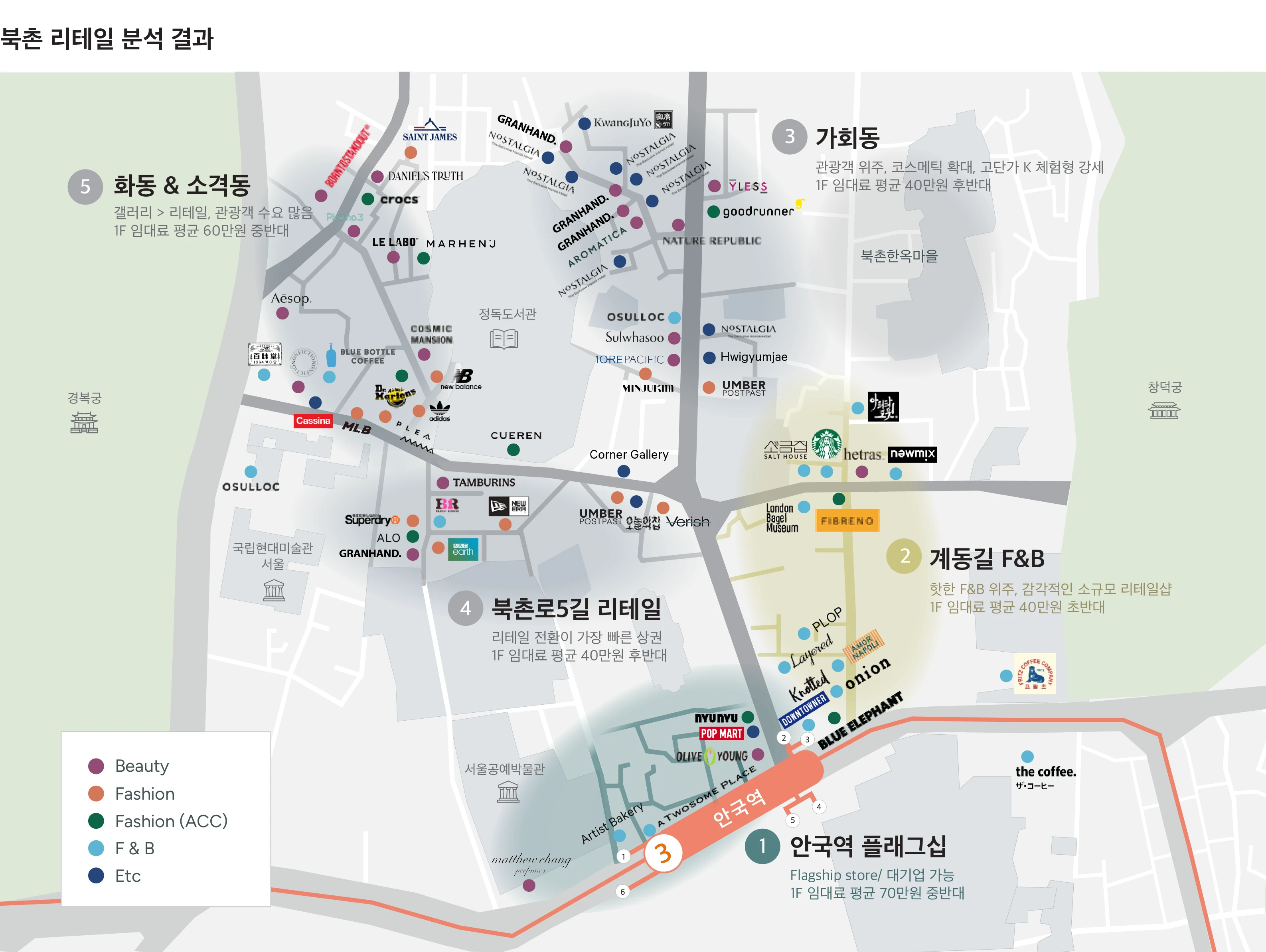 안국역, 자본과 속도의 프라임 관문: 북촌의 진입로이자 가장 강력한 집객력을 가진 안국역 일대는 대형 법인 중심의 통건물 플래그십 스토어 격전지로 변모하며 마케팅 효율을 극대화하는 전략적 요충지가 되었다.