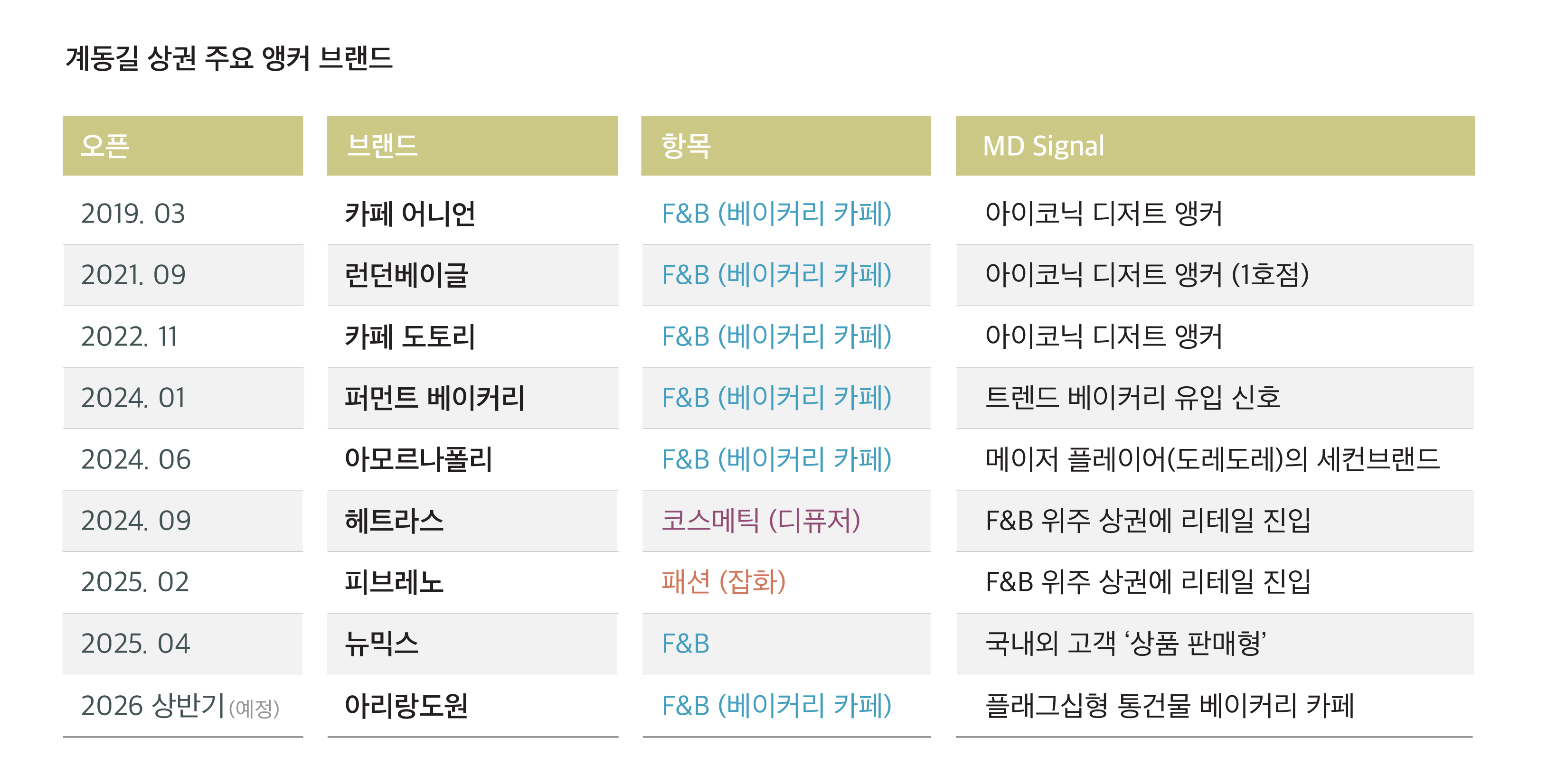 계동길, 주 7일 안정성이 담보된 F&B 거점: 오피스·학군·관광 수요가 겹치는 계동길은 런던베이글 등 메가 앵커 테넌트를 중심으로 힙한 F&B와 기프트 리테일이 공존하며, 낮 피크 타임의 높은 회전율을 바탕으로 안정적 매출을 창출한다.