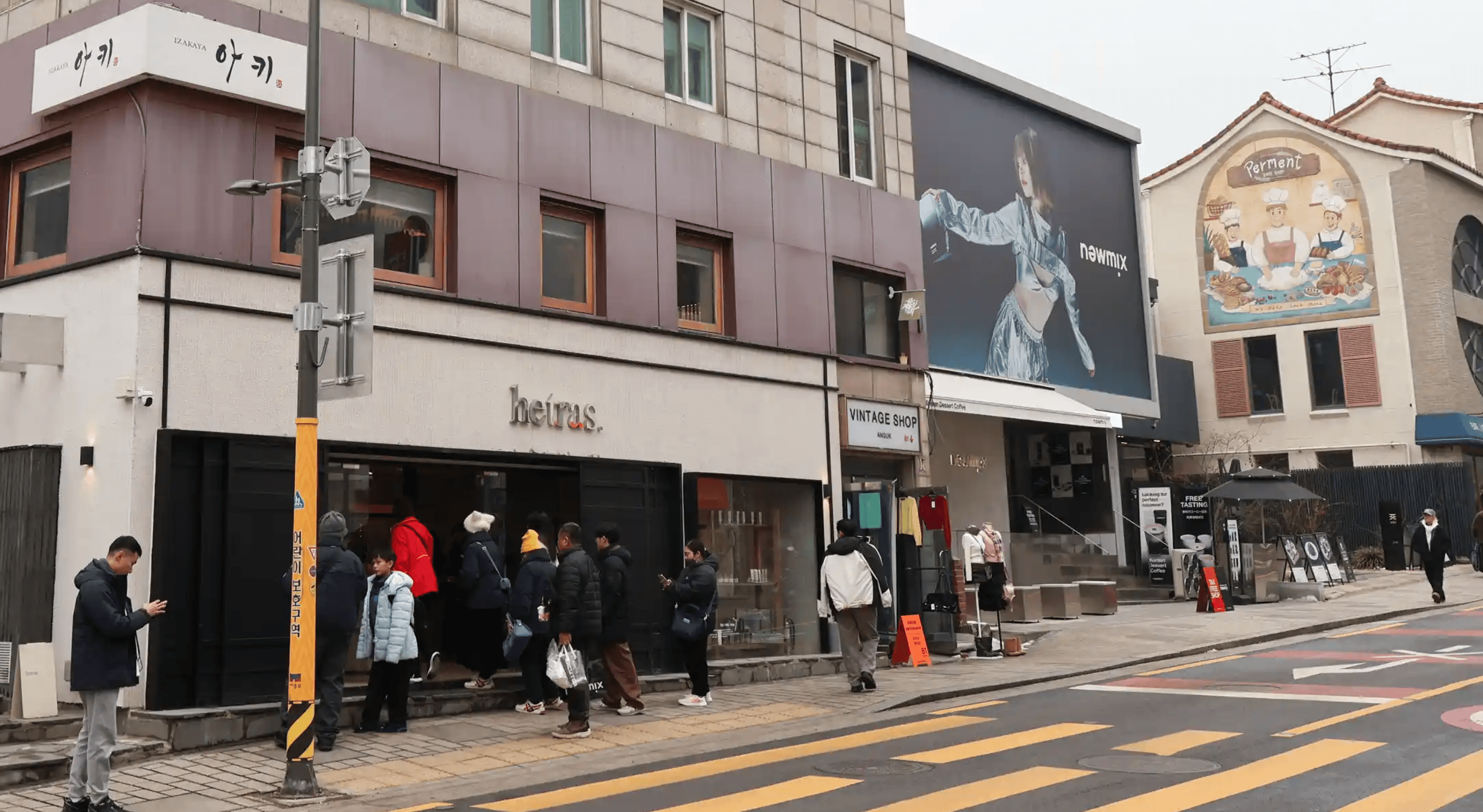 Image 3: 베이커리 카페 군집 지역을 지나면 패션 리테일이 등장하며 가로의 성격이 전환된다. 기존 뵈르뵈르 아이스크림 부지는 피브레노 건물 매입 후 신규 입점하였으며, 맞은편에는 헤트라스와 뉴믹스가 위치해 외국인 관광객 타겟의 리테일 앵커 역할을 하고 있다. 2월 초 혹한기임에도 불구하고 헤트라스 매장으로 유입되는 방문객 유동이 압도적으로 관찰되었다.