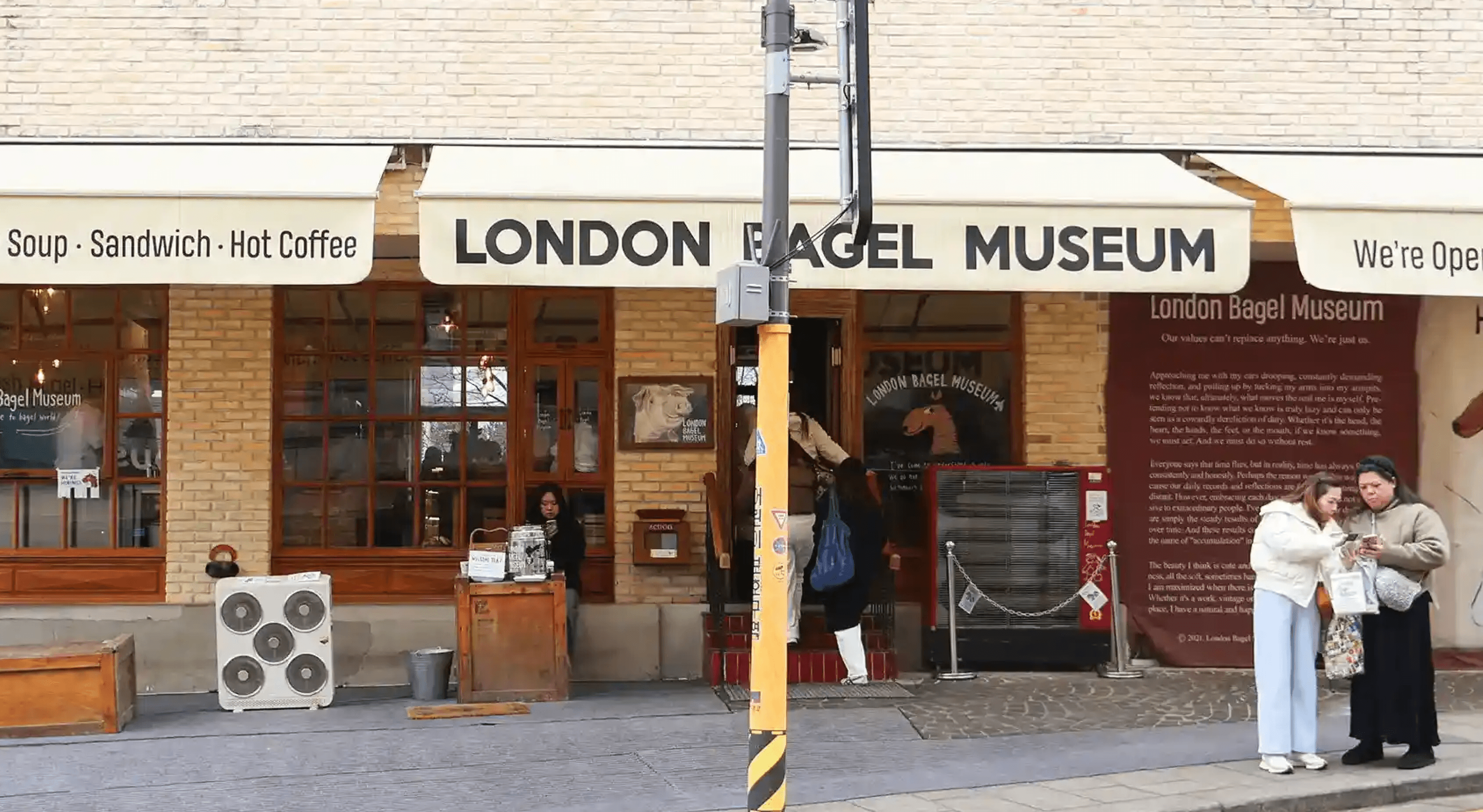 Image 2: 평일 오후 기준 런던 베이글은 내국인보다 외국인 비중이 압도적이다. 도로 맞은편 소금집이 위치해 있어 두 매장 간의 대치 구조가 형성되어있다.
