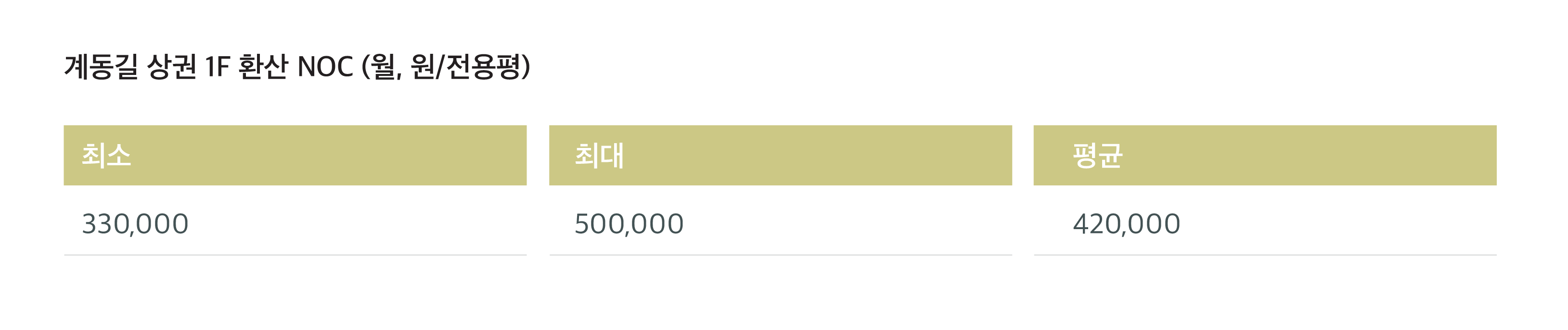 계동길: 주거와 상업이 공존하며 동선이 긴 계동길의 특성상, 일회성 방문객보다는 재방문 주기가 명확한 브랜드가 적합. 단순한 공방 수준을 넘어, 브랜드의 철학을 깊게 경험할 수 있는 라이프스타일 브랜드의 장기 체류형 공간이나, 목적형 방문을 유도할 수 있는 희소성 있는 테넌트 배치가 핵심.