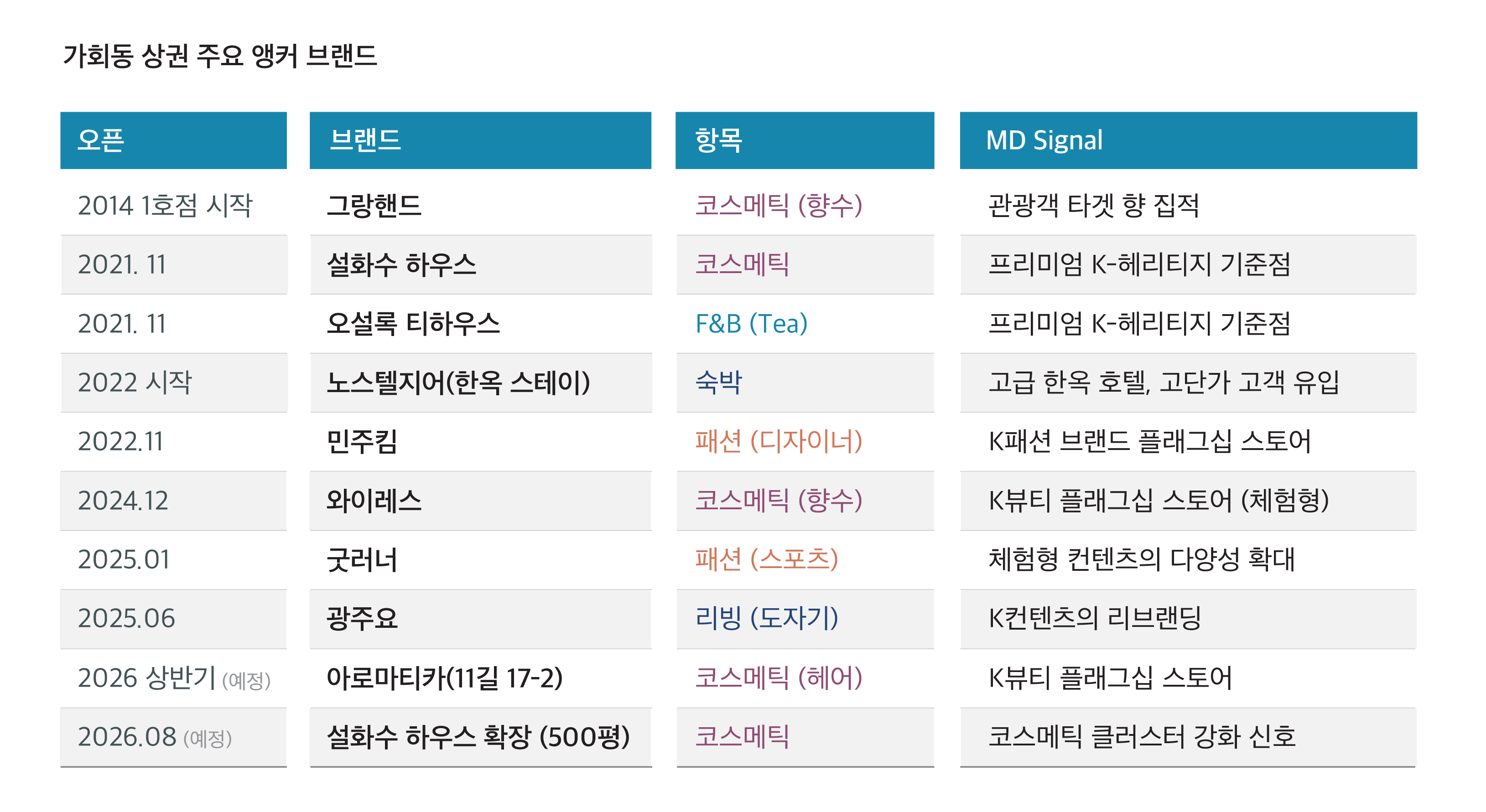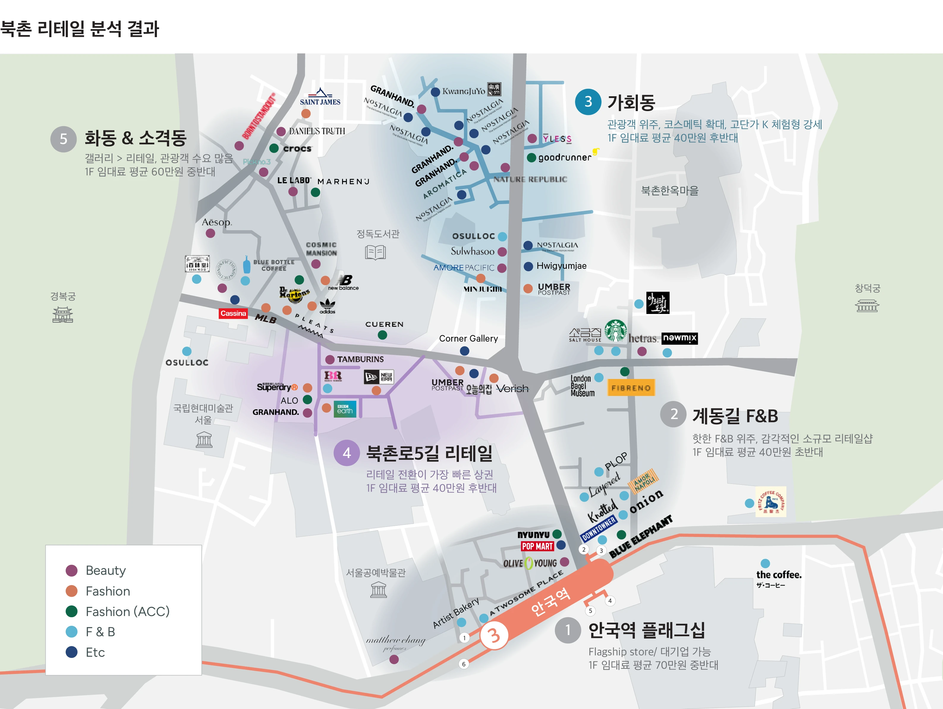 가회동과 북촌로 5길은 고감도 브랜드들의 클러스터링이 가속화되는 구간으로, 입지별 콘텐츠 차별화와 정교한 포지셔닝이 성패를 가를 것으로 분석된다.