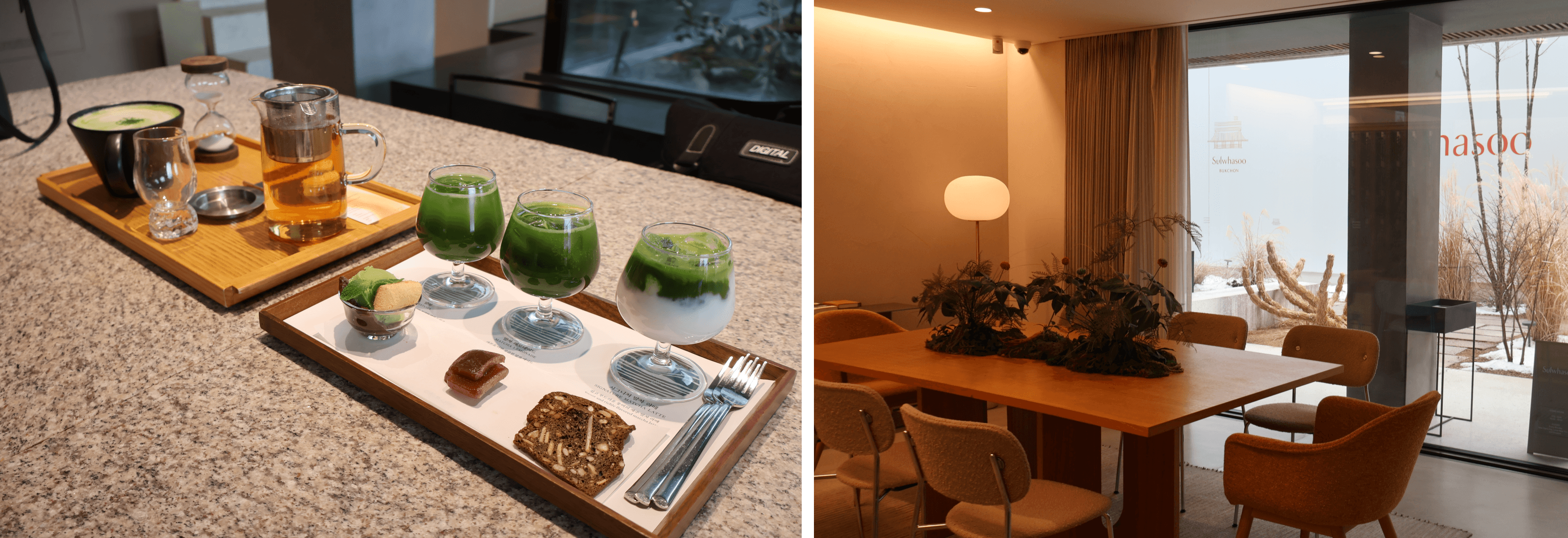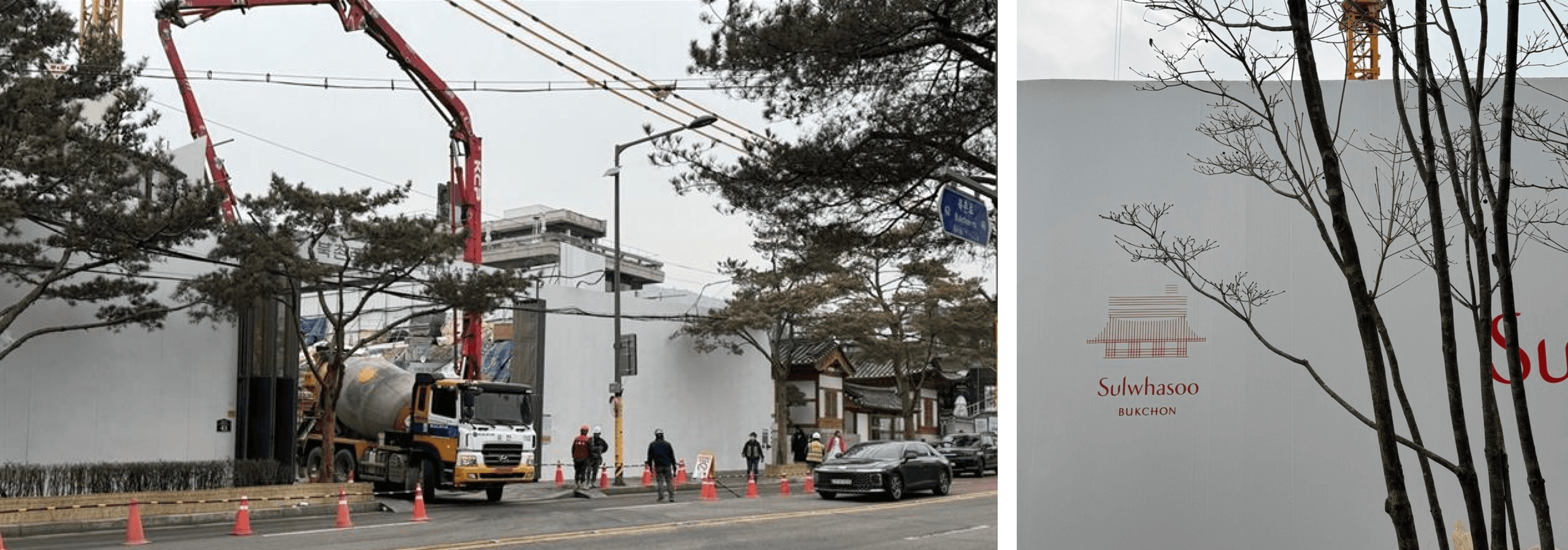 Image 1: 위의 사진은 오설록 내부 전경. 북촌 조망이 가능해 평일에도 내외국인 인파가 몰린다. 아래는 설화수 매장으로, 내부에는 양손 가득 쇼핑백을 든 관광객들로 항상 붐비는 북촌의 핵심 앵커 시설이다. 사진에서 보이는 설화수 좌측에는 아모레퍼시픽의 대규모 복합문화공간이 2026년 8월 말 준공을 목표로 공사 중이며, 향후 가회동 리테일 지형을 새롭게 재편할 전망이다.