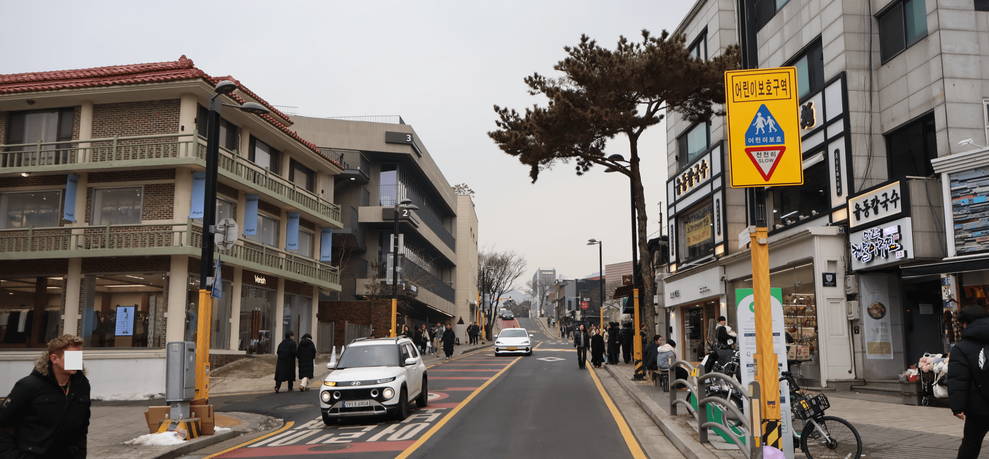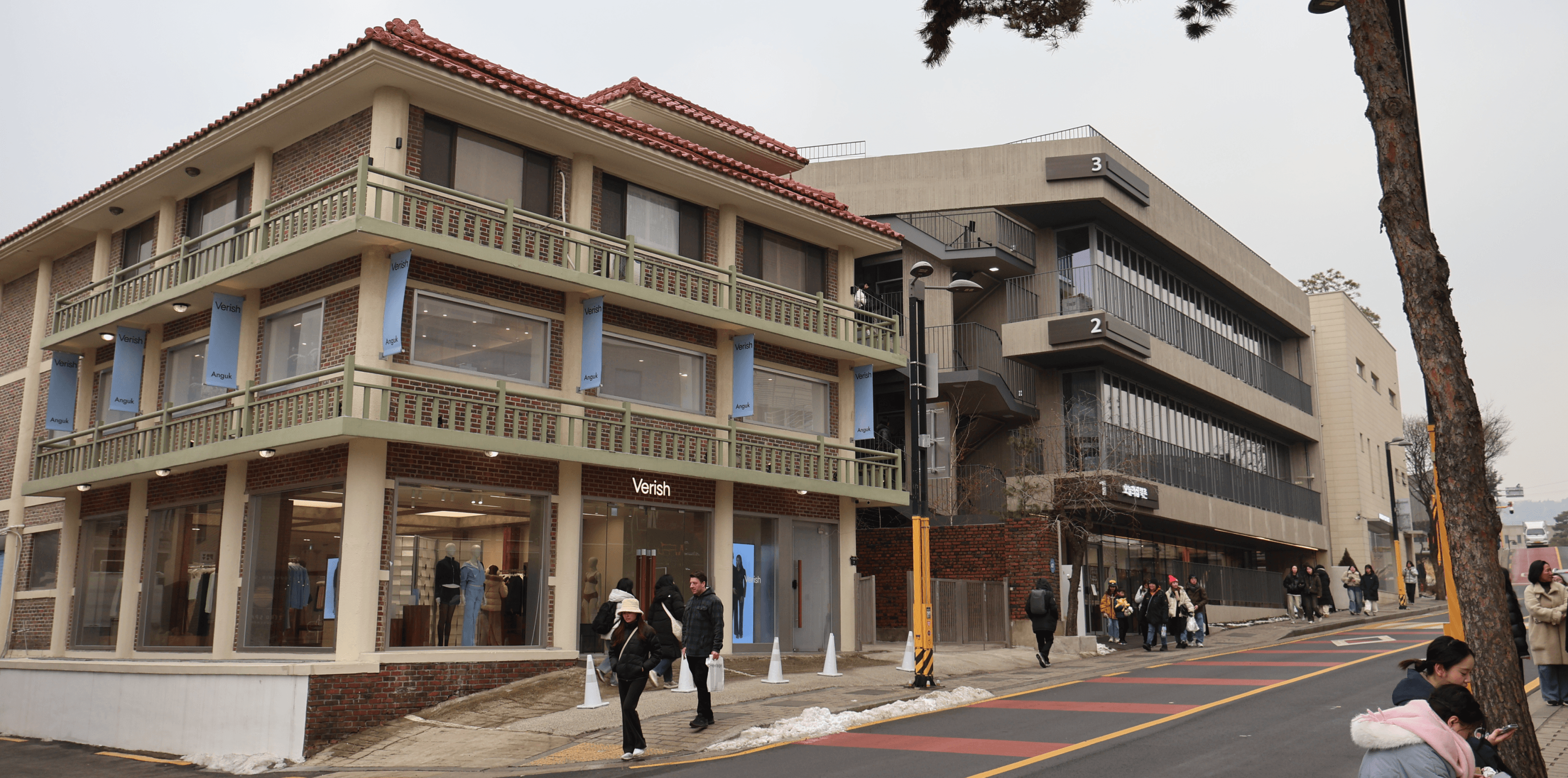 Image 1 (건물 클로즈업): 글로벌 브랜드 중심의 화동&소격동과 달리, 이곳은 한국적 색채를 현대적으로 재해석한 K-브랜드들의 플래그십 스토어가 주를 이룬다. 사진에서 보이는 좌측 건물은 Verish, 우측은 오늘의 집.