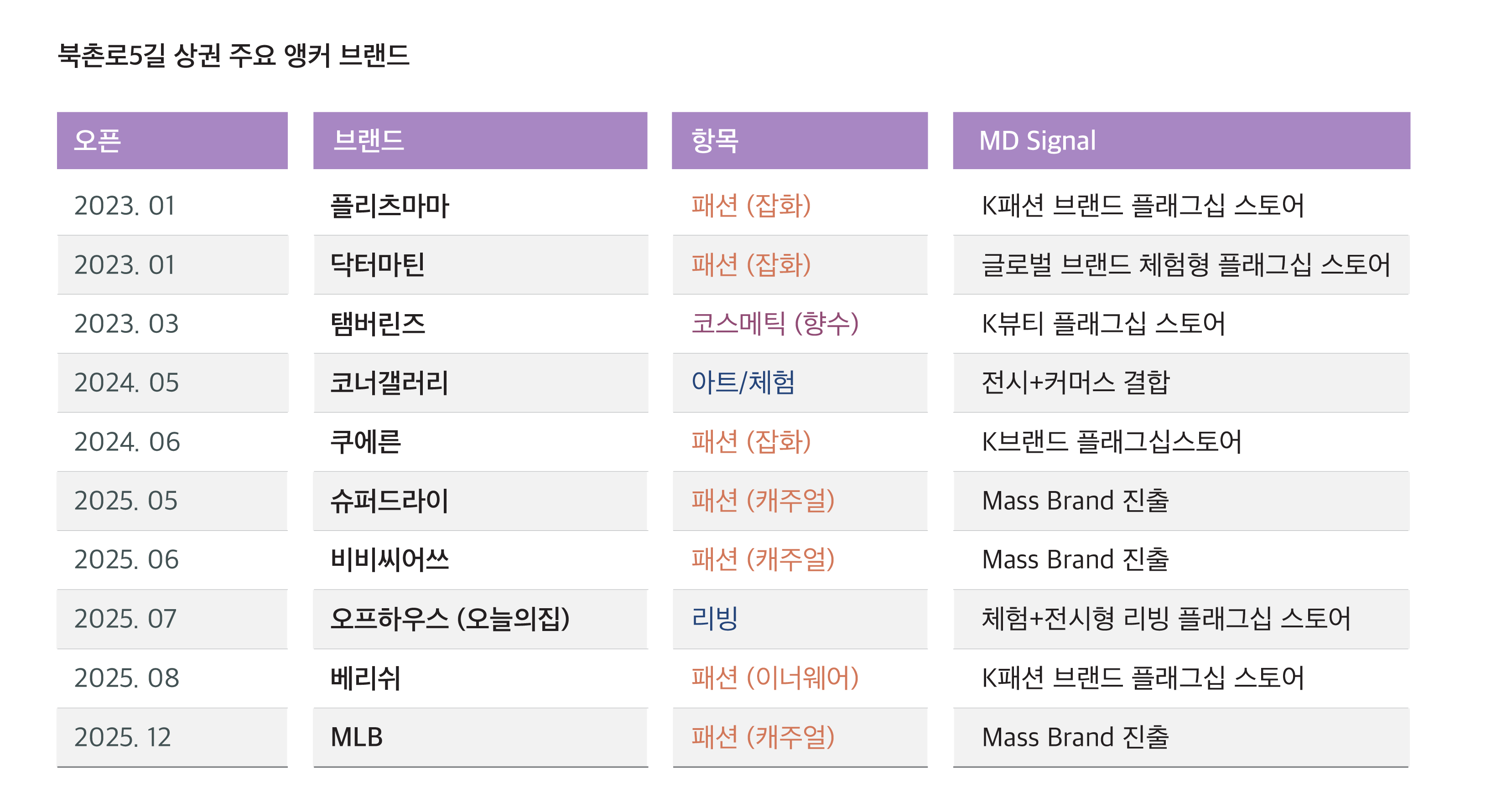 북촌로5길: 탬버린즈를 필두로 K-브랜드의 팬덤이 실제 구매로 전환되는 가장 직관적인 클러스터이다. 한남동과 성수동의 감성을 공유하는 MZ 및 외국인 타깃의 쇼룸형 뷰티·패션 브랜드나 , 전시와 체험이 결합된 아트 커머스 등 브랜드의 독보적인 세계관을 경험적으로 설계할 수 있는 콘텐츠 기반 브랜드가 적합.