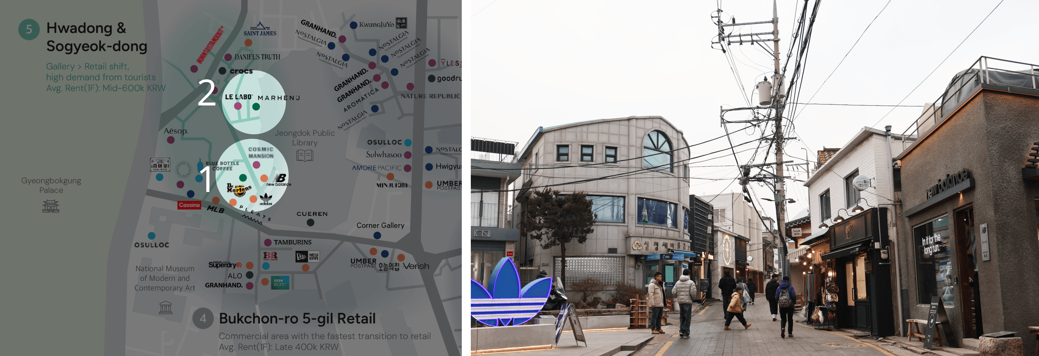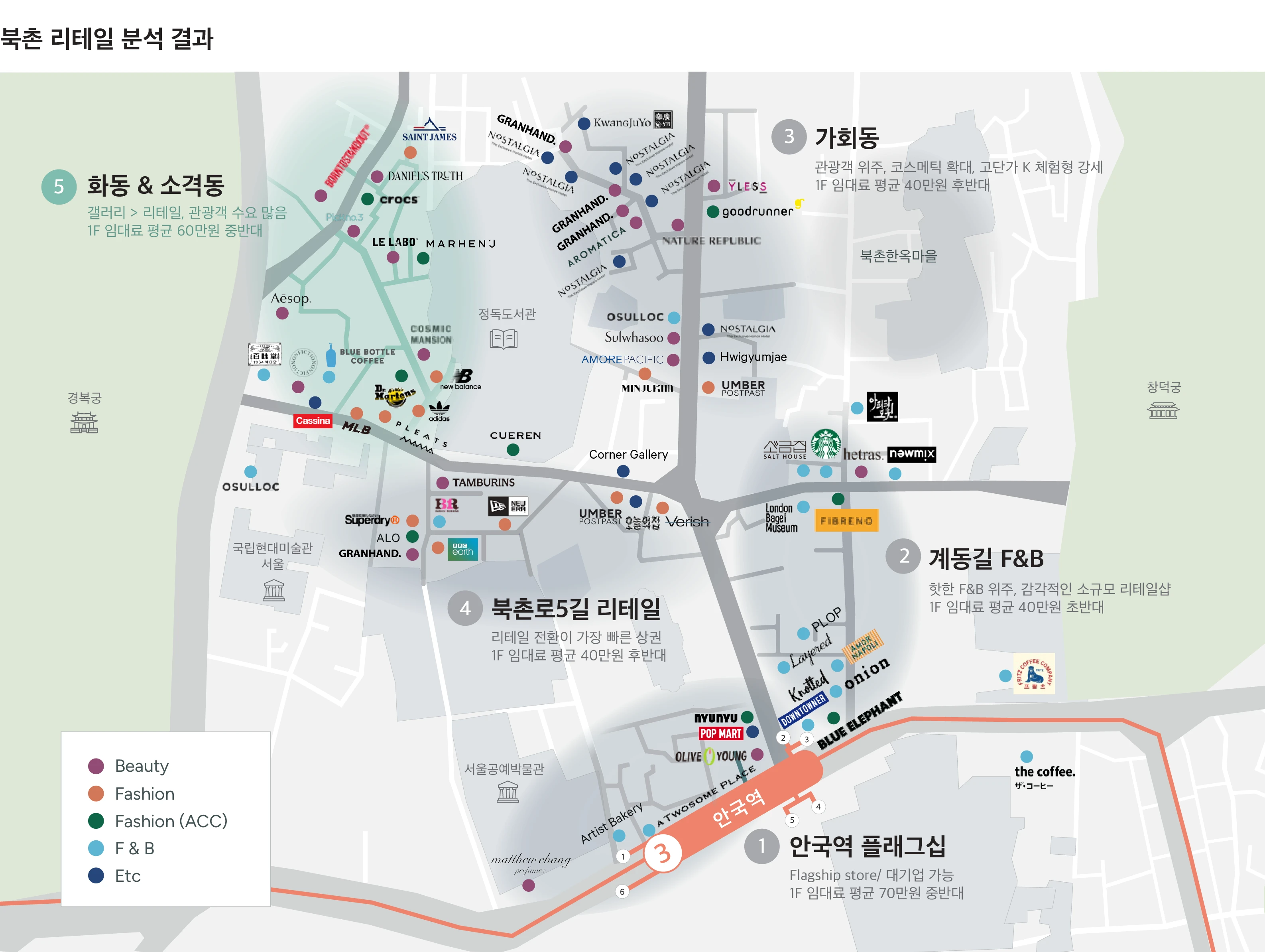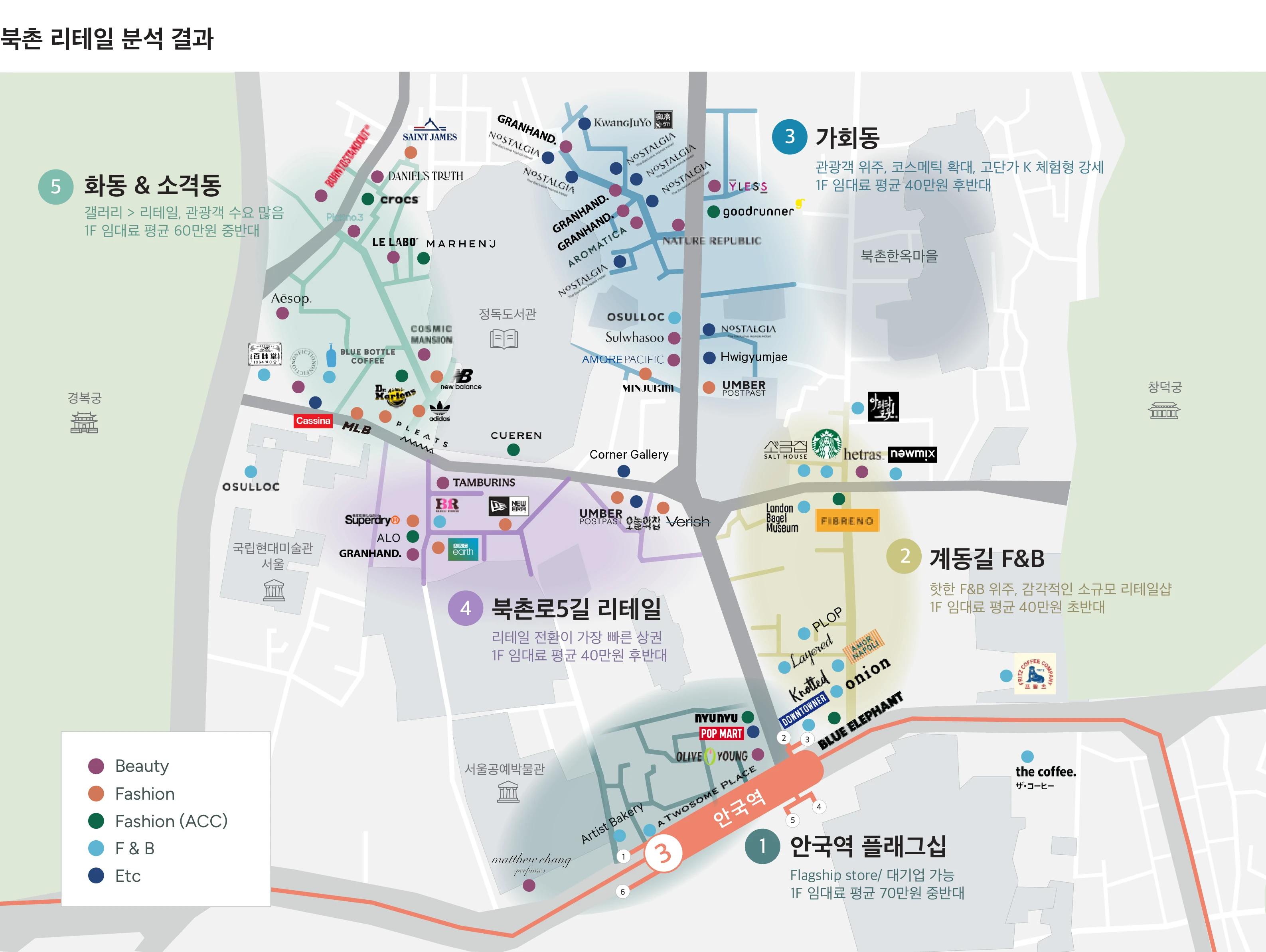북촌로5길: 감도와 네이버링. K-브랜드 클러스터 내에서 인접 브랜드와의 시너지를 극대화할 수 있는 차별화된 체험 설계가 필수다.