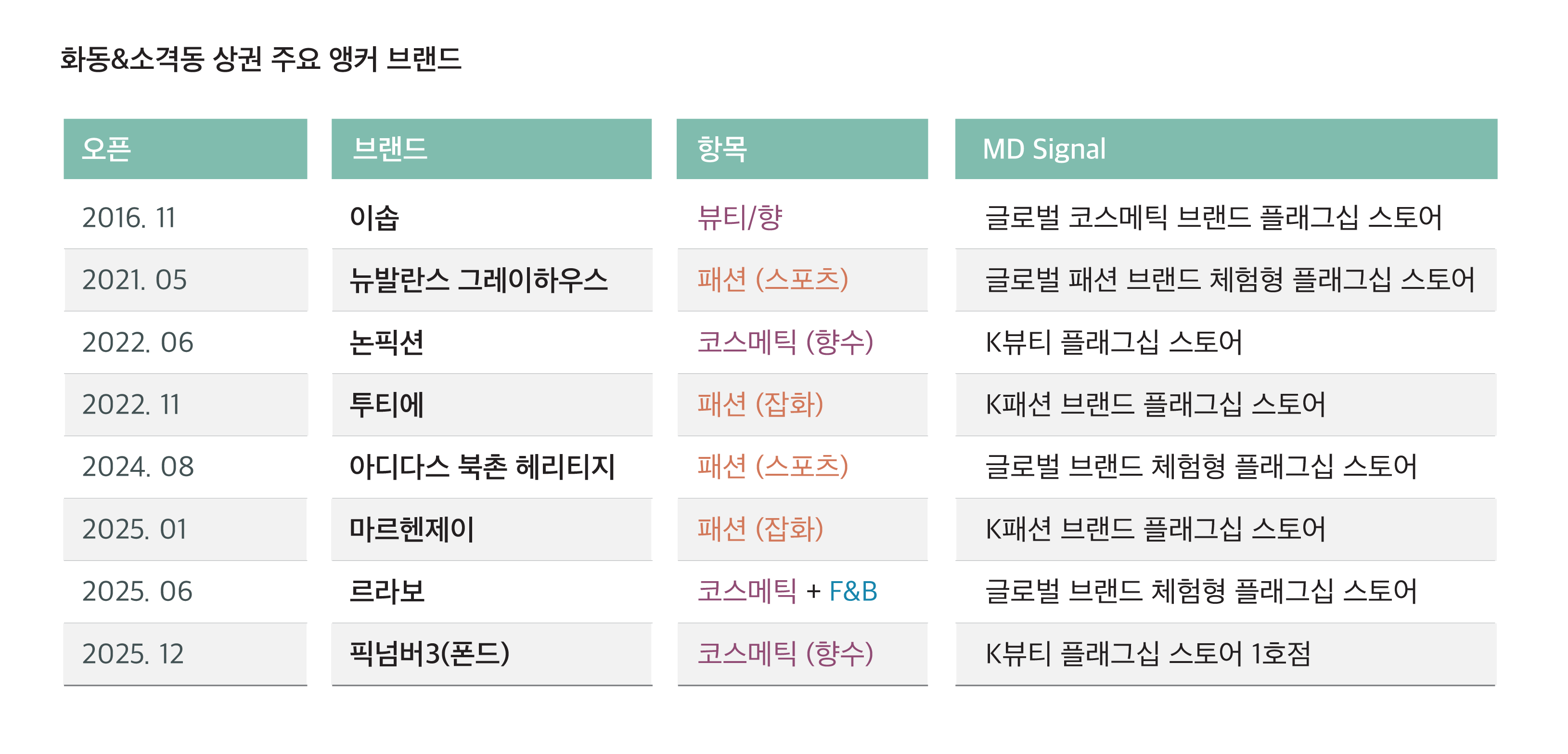 글로벌과 로컬이 교차하는 리테일 코어: 화동·소격동은 블루보틀, 뉴발란스, 르라보 등 메이저 브랜드들이 한국적 로컬리티를 재해석한 체험형 플래그십을 집결시키며 북촌 내 가장 엣지 있는 글로벌 메인 스트림을 형성했다.