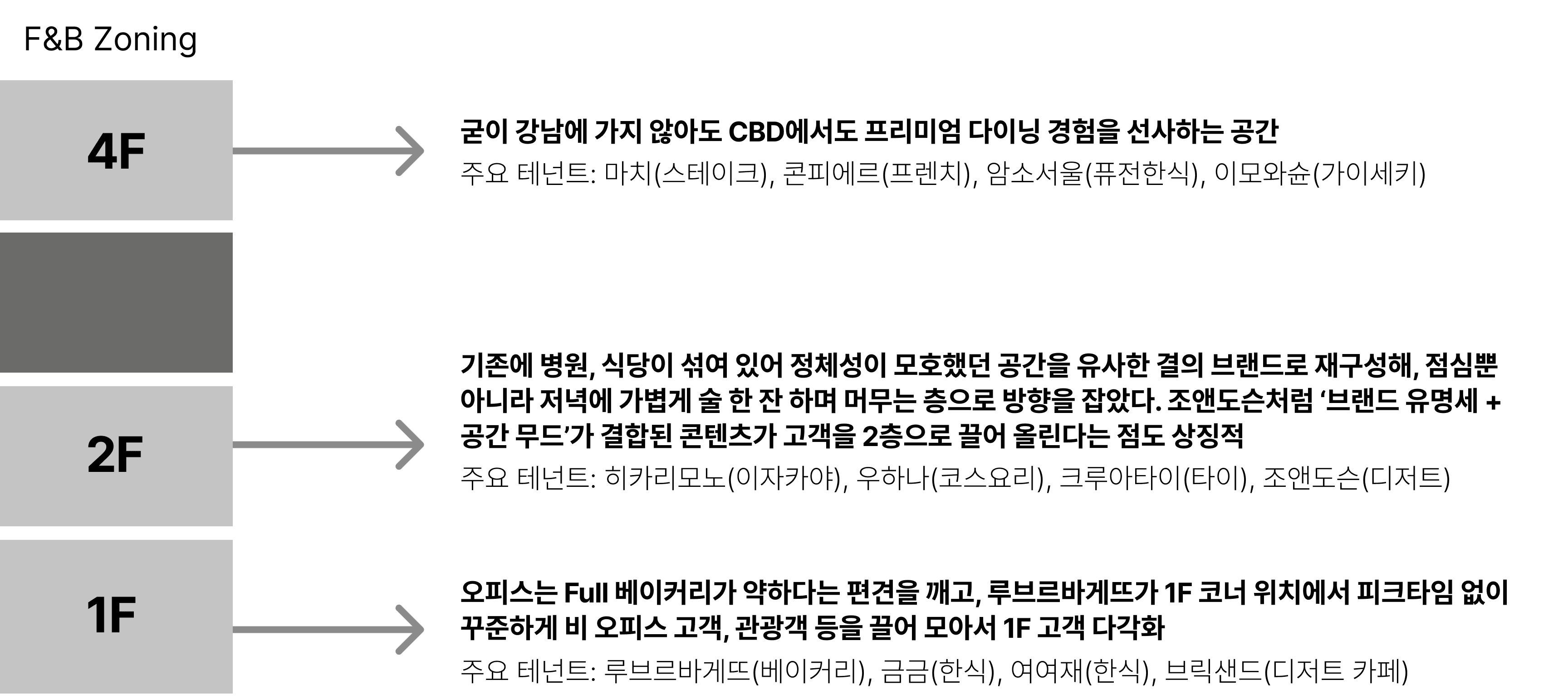 MD Layout | 고밀도 F&B를 ‘혼잡’이 아니라 ‘선택권’으로 체감하게 만드는 구성. 오피스 상권에서도 쇼핑몰처럼 ‘머무는 가치’를 미식으로 구현 |