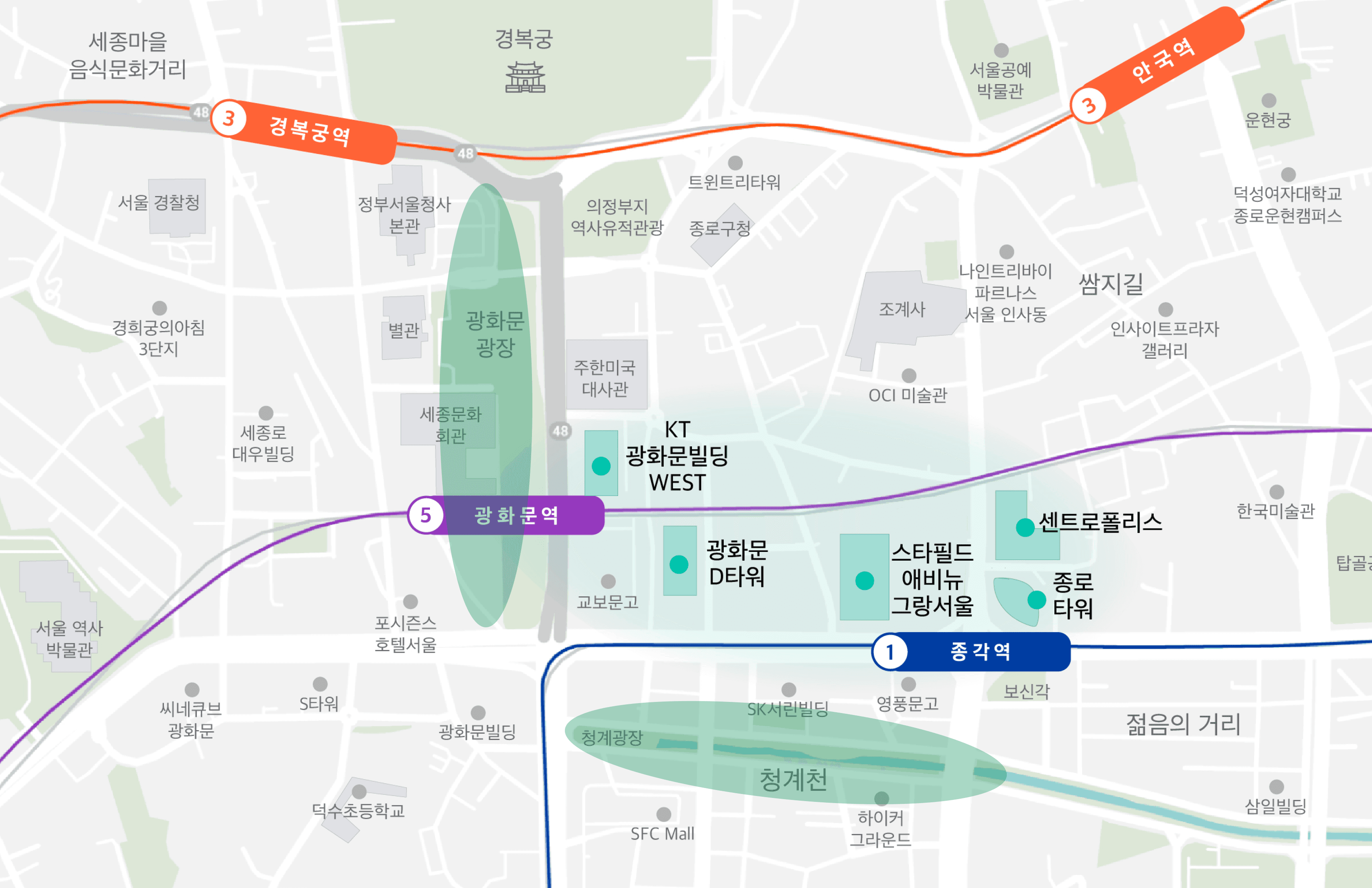 2022년 완료된 광화문광장 재구조화 사업으로 서측 보도(세종문화회관 방면)가 광장으로 편입되었고, 차량 중심에서 보행자 중심의 공간으로 재편. 광화문광장에서 세종대로를 따라 D타워와 그랑서울을 지나 청계천으로 이어지는 보행축은 서울시가 추진하는 ‘보행일상권’ 전략의 핵심