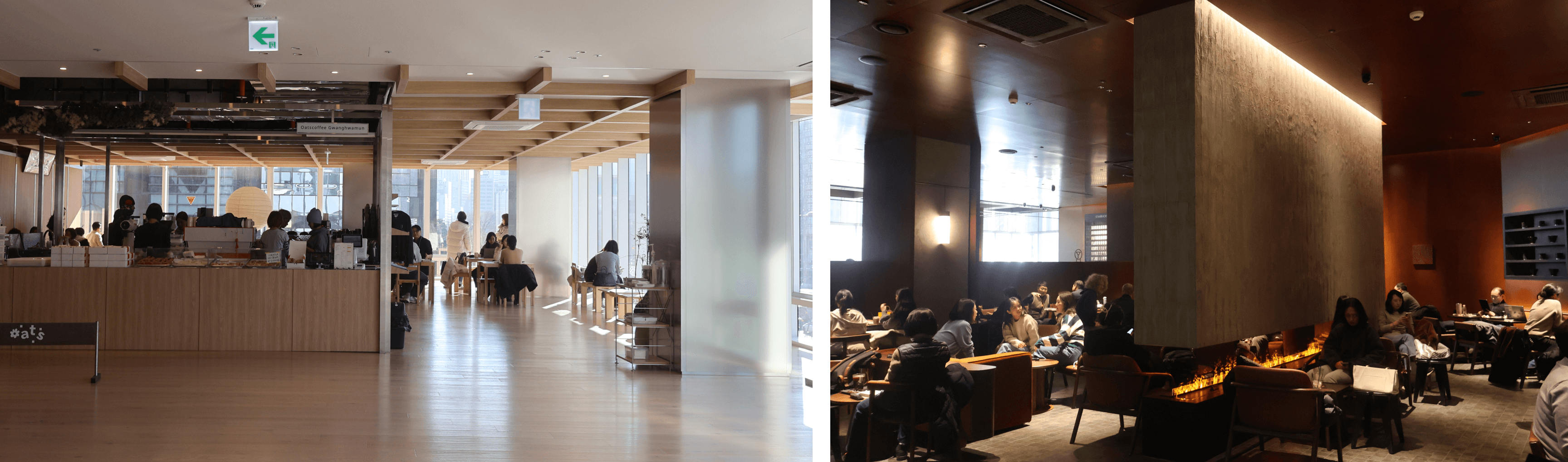 좌측부터, 사옥 내 상주 인구와 외부 방문객을 연결하는 감도 높은 F&B 유입(오츠커피)와 광화문 광장을 정면으로 마주하는 프라임 입지에 위치하는 스타벅스 리저브