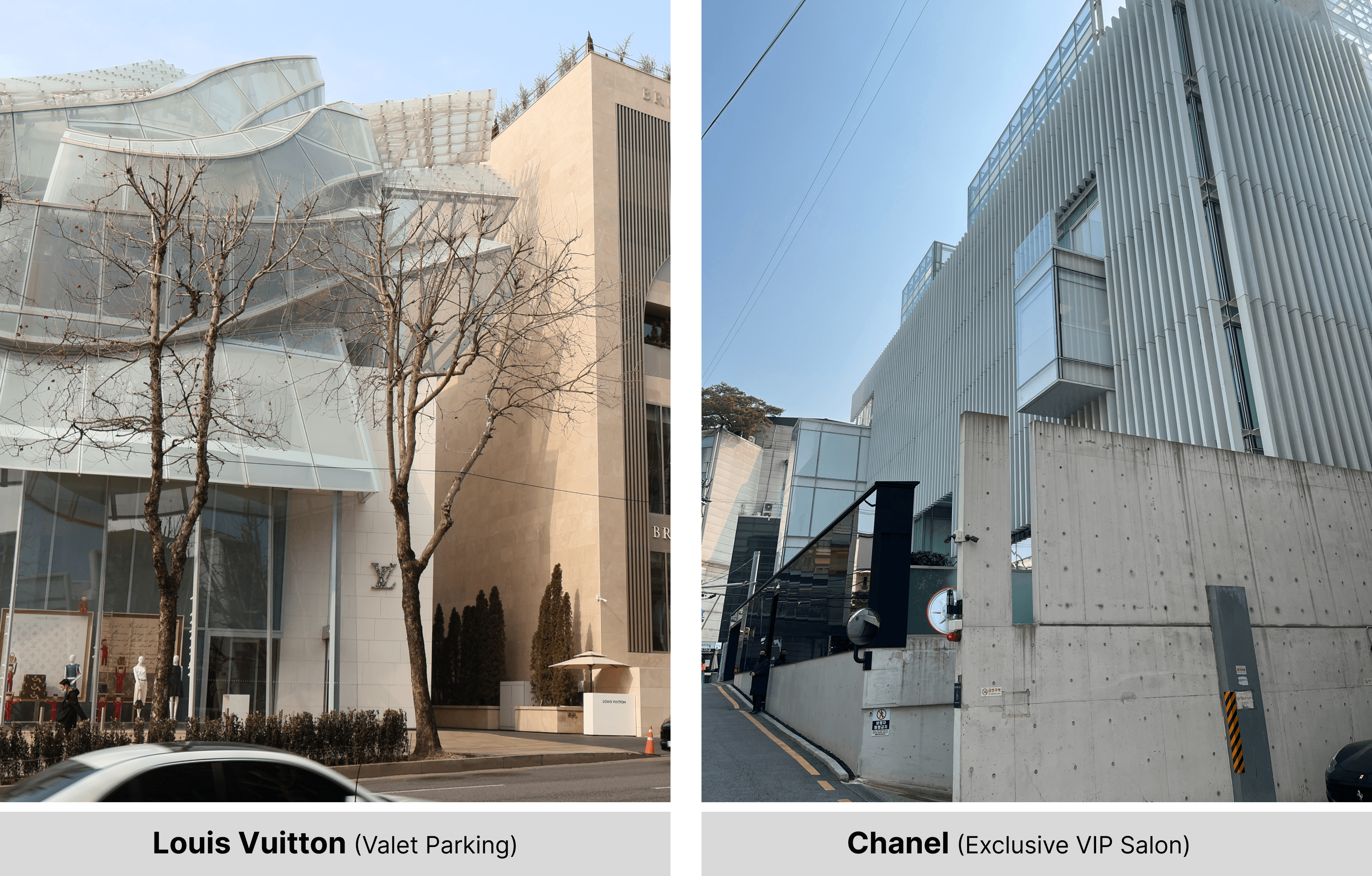 청담동 대로변에 대중적인 유동 인구가 유입되자, 하이엔드 하우스들은 진짜 VVIP들을 위한 공간을 이면 도로와 건물의 상층부로 숨기기 시작했다. 대표적으로 샤넬은 대로변의 공개된 매장 외에도, 외부인의 시선이 닿지 않는 이면 구역이나 프라이빗 층에 별도의 거점을 마련하여 VVIP들에게 극도로 배타적인 환경을 제공한다.