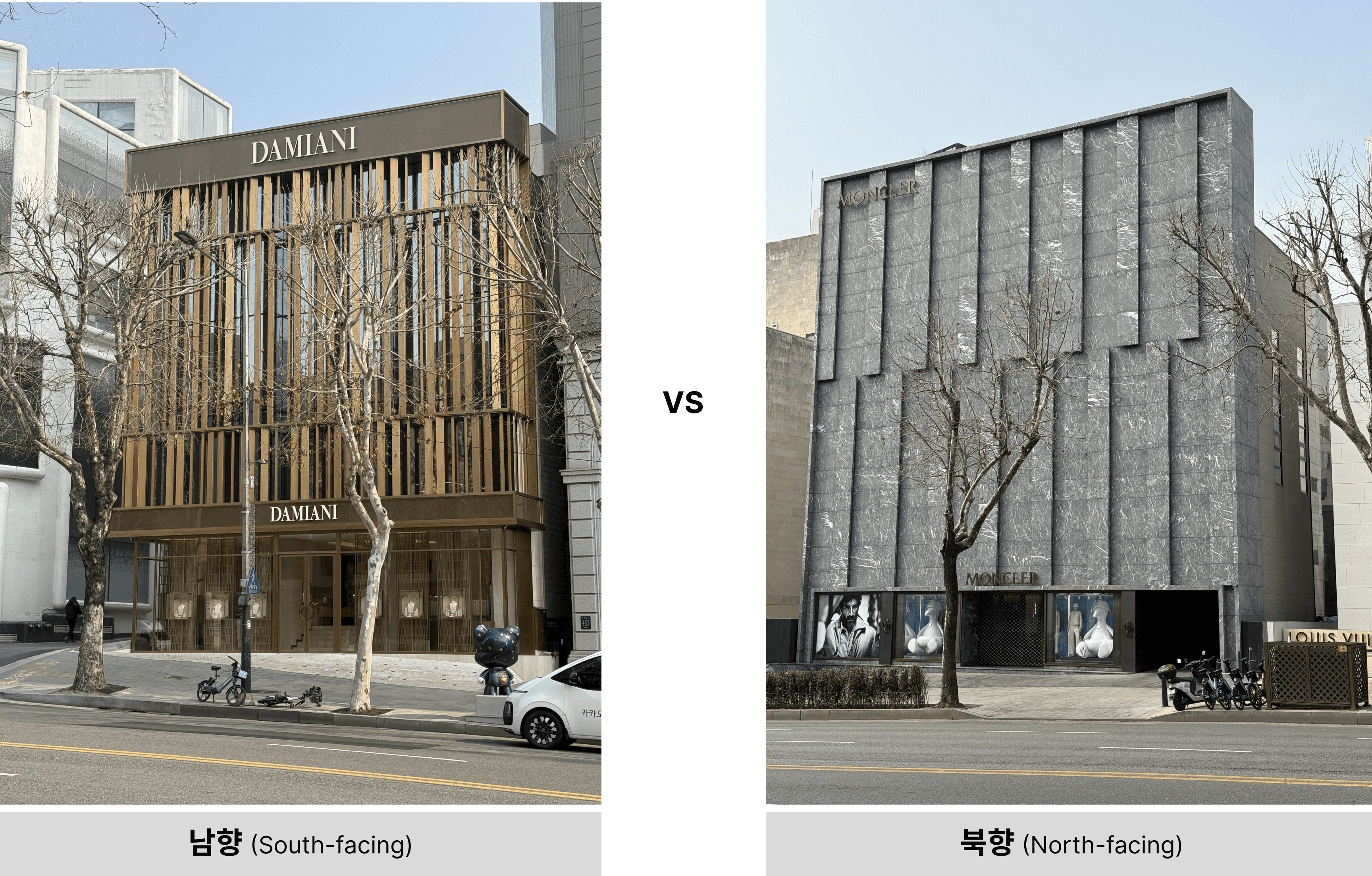 예시로 몽클레르 청담의 외관은 세계적인 건축가 기욤 사바(Gwenael Nicolas)가 디자인했는데 가장 두드러진 특징은 거대한 암석을 연상시키는 짙은 회색의 리브드(Ribbed) 스톤 파사드이다. 일반적인 매끄러운 대리석이 아니라 거칠고 단단한 질감을 살린 이 소재는, 마치 알프스의 거대한 암벽을 통째로 옮겨놓은 듯한 묵직한 존재감을 드러내 몽클레르가 가진 아웃도어의 뿌리와 고산 지대의 견고함을 시각적으로 증명하였다. 이처럼 남측에 위치한 매장의 강렬한 외관은 고객이 매장에 발을 들이기 전부터 브랜드의 아이덴티티를 온몸으로 느끼게 만든다. 이들은 투명한 유리창 대신 브랜드 고유의 패턴이나 실험적인 소재로 파사드를 뒤덮음으로써, 거리를 지나는 이들에게 '이곳은 선택된 자들만이 공유하는 성역'임을 시각적으로 선포한다. 남측 라인의 패션 하우스들에게 입지는 빛을 받는 자리가 아니라, 브랜드의 서사를 건축적으로 구현하여 도시의 랜드마크를 세우는 자리이다.