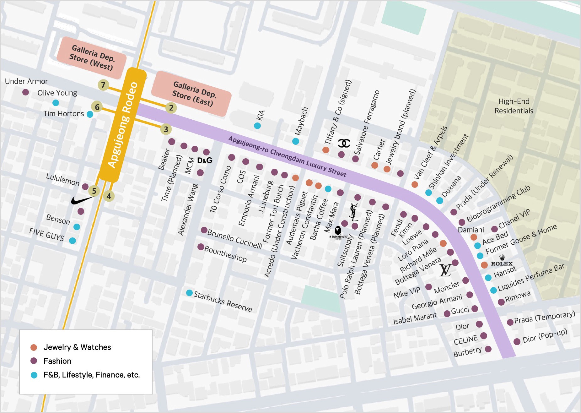 압구정로 북측(남향)에는 하이 주얼리가, 남측(북향)에는 패션 하우스가 집결한다. 채광 방향까지 계산된 리테일 공학이 청담동 상권을 만들었다.