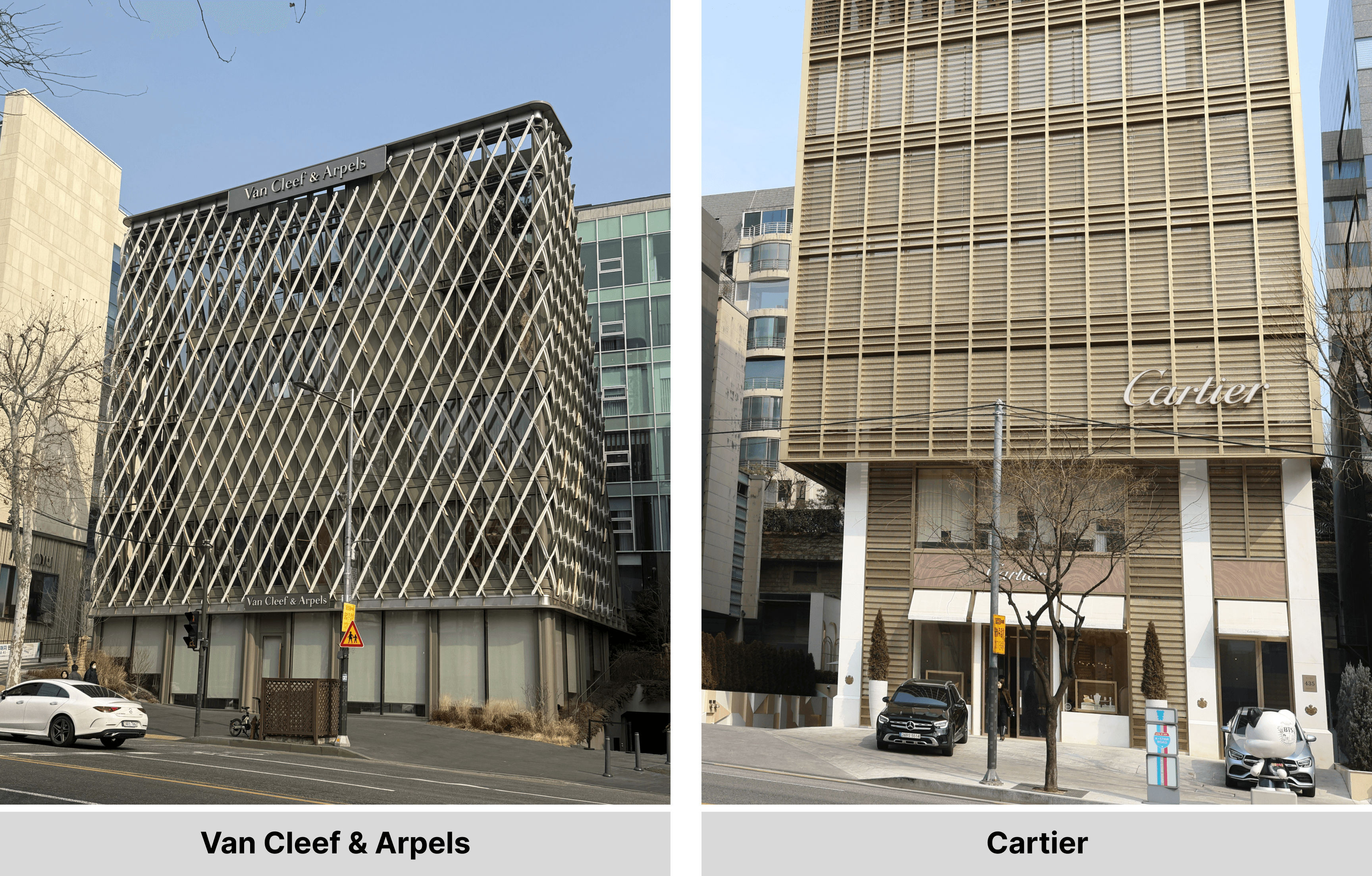 까르띠에는 기존 메종 자리에 샤넬이 들어서게 되면서 자리를 옮겨야 했으나, 여전히 북측(남향) 라인 내에서 이동하며 해당 입지를 고수하고 있다. 이는 주얼리 브랜드에게 남향이 갖는 가치가 단순한 점유를 넘어 생존 전략임을 방증한다. 또 다른 케이스인 반클리프 아펠은 이 전략적 요충지인 북측 라인에만 두 개의 매장을 운영(서울 메종과 기존 매장)하며 상권 지배력을 공고히 하고 있다. 특히 최근 구축된 메종은 단순히 제품을 비추는 것에 그치지 않고, 건물 외관 자체를 보석처럼 반짝이게 설계했다. 쏟아지는 직사광선을 받은 특수 외장재는 그 자체로 거대한 다이아몬드처럼 빛나며, 도보객이 아닌 차량 이동객들에게까지 브랜드의 존재감을 강렬하게 투사한다. 이들에게 북측 라인은 제품과 건물 모두를 '빛의 예술'로 완성시키는 대체 불가능한 전략적 요충지이다.
