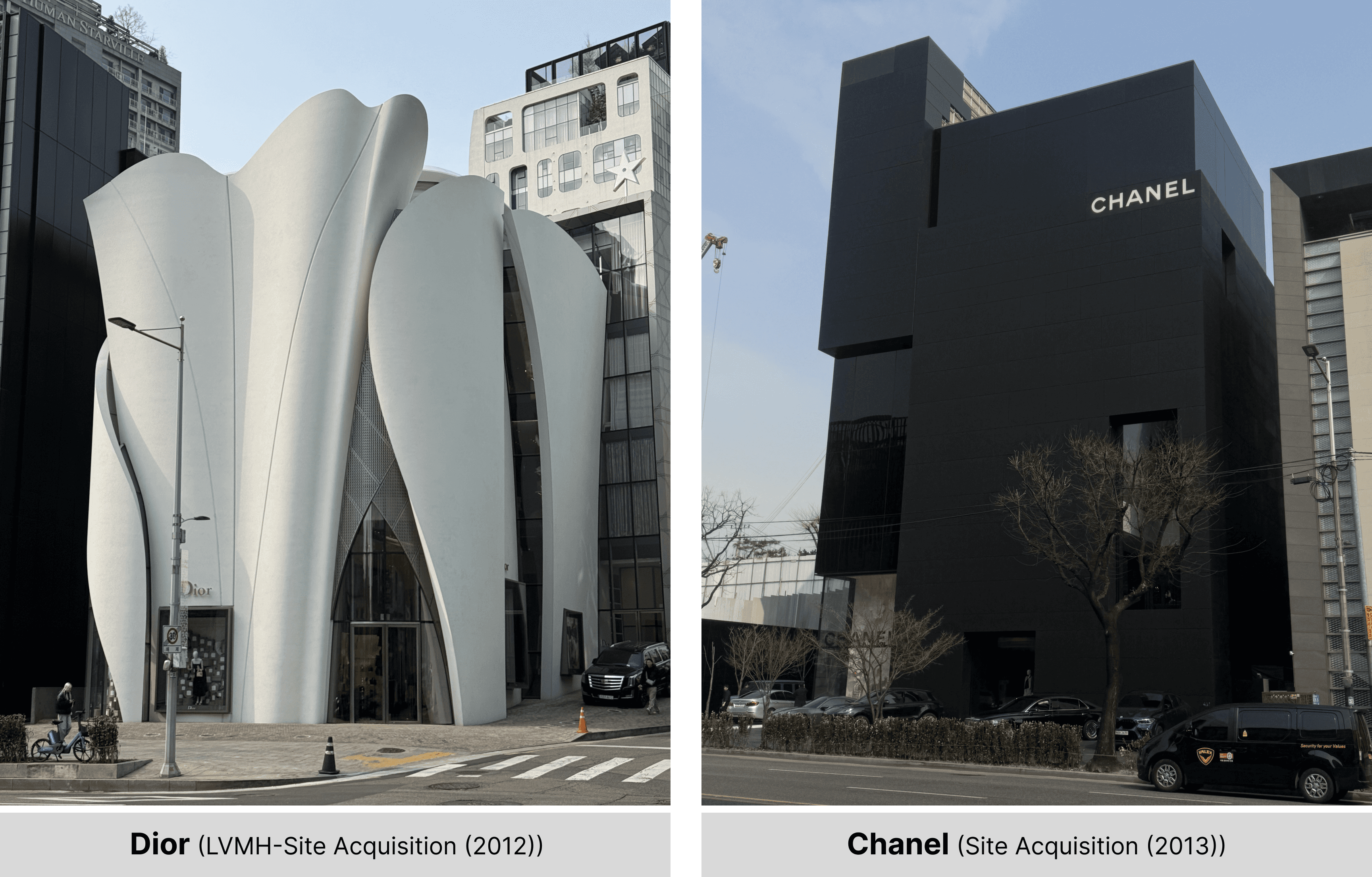 LVMH와 샤넬은 핵심 부지를 직접 매입하여 건물을 신축하는 자산 소유 전략을 취한다. 샤넬의 경우, 2013년 당시 약 700억 원이라는 기록적인 금액으로 부지를 매입하며 화제를 모았다. 디올(House of Dior) 역시 수백억 원 규모의 부지를 매입하며 독자적인 브랜드 거점을 마련했다.